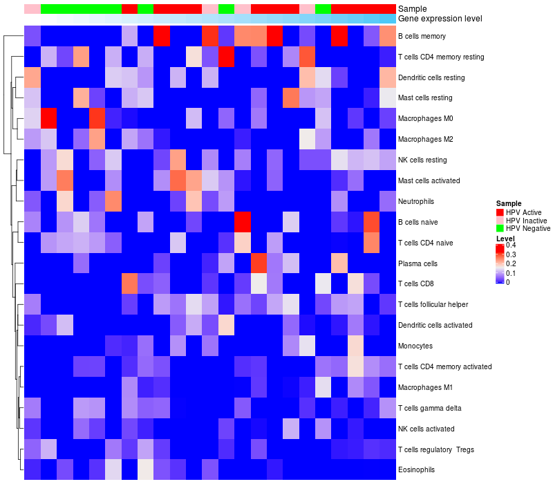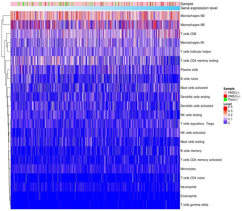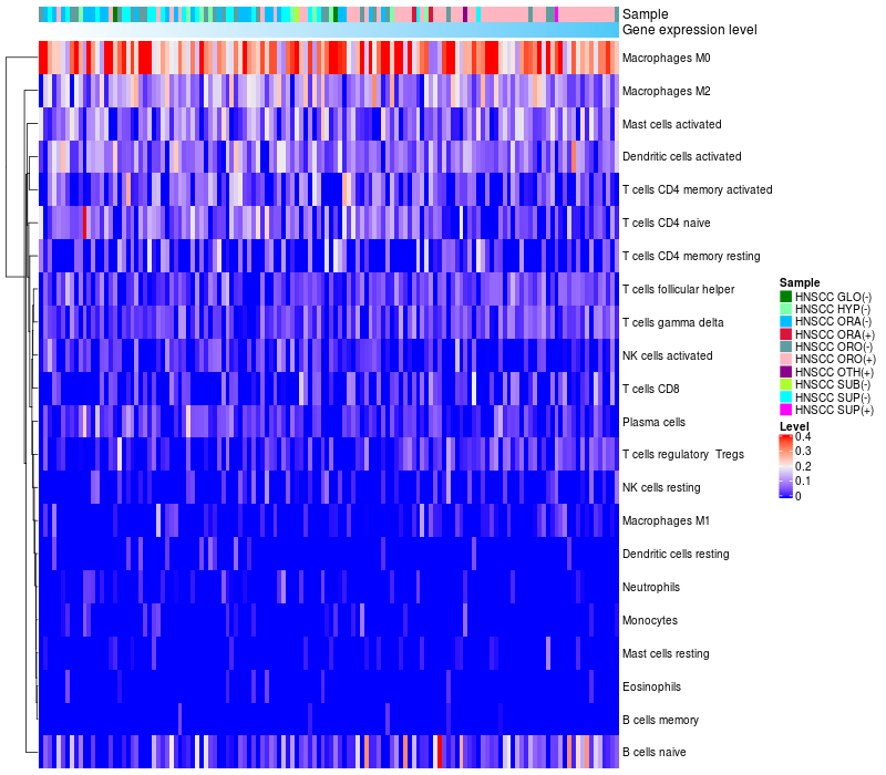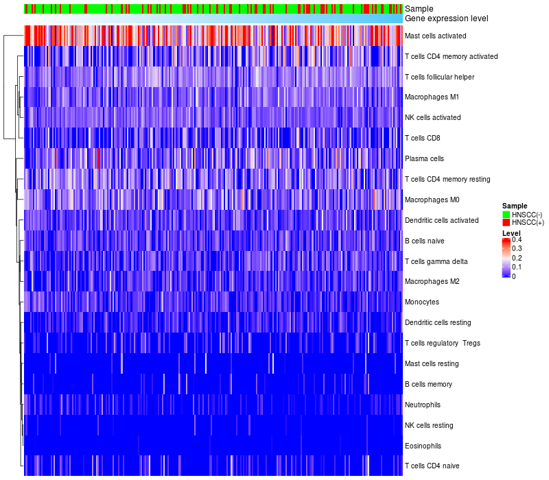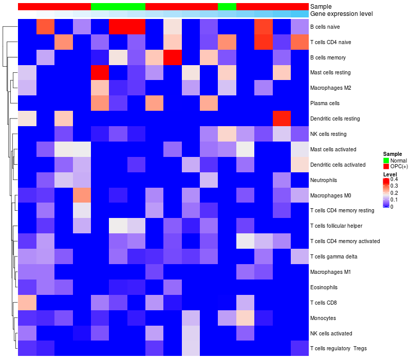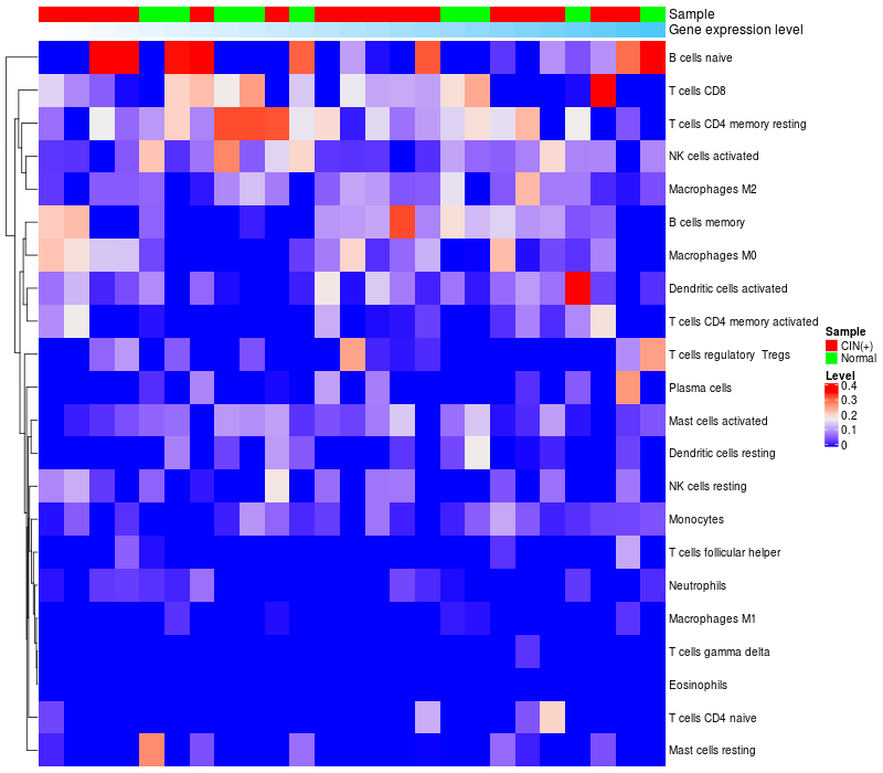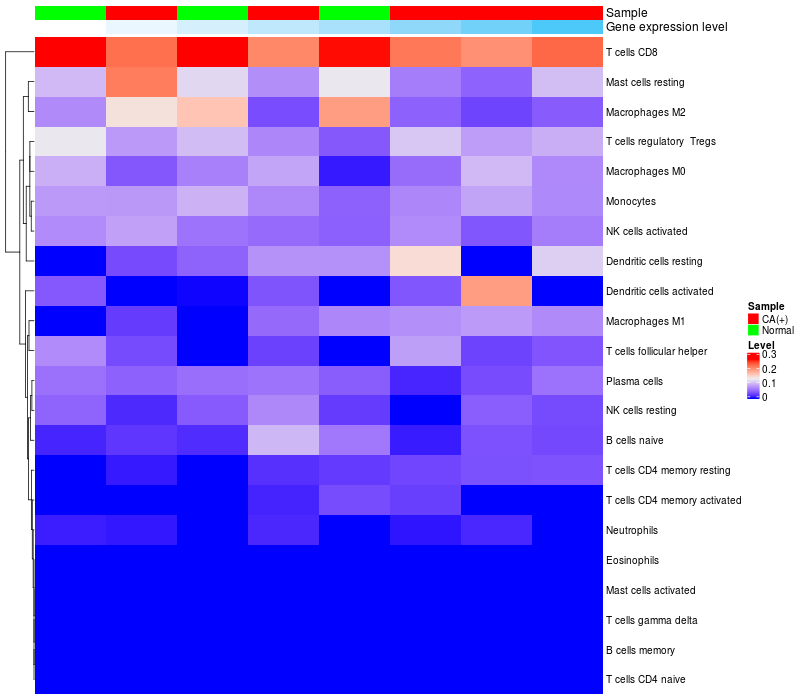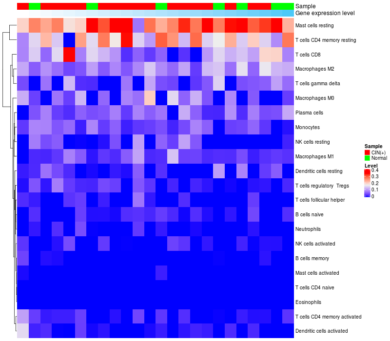 • Left: Heatmap of target gene expression and the level of various types of immune cells (cell type fractions) in all samples based on CIBERSORT method.