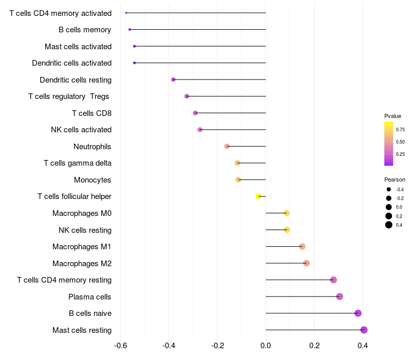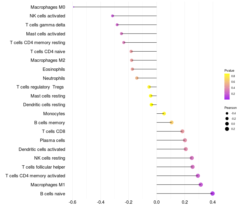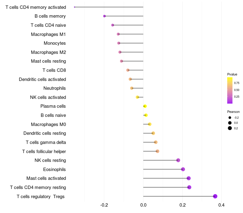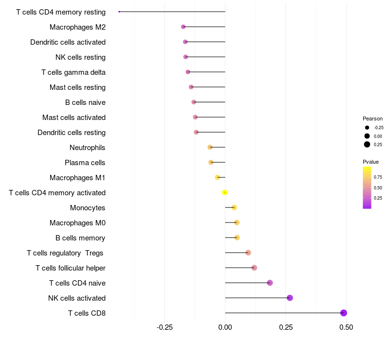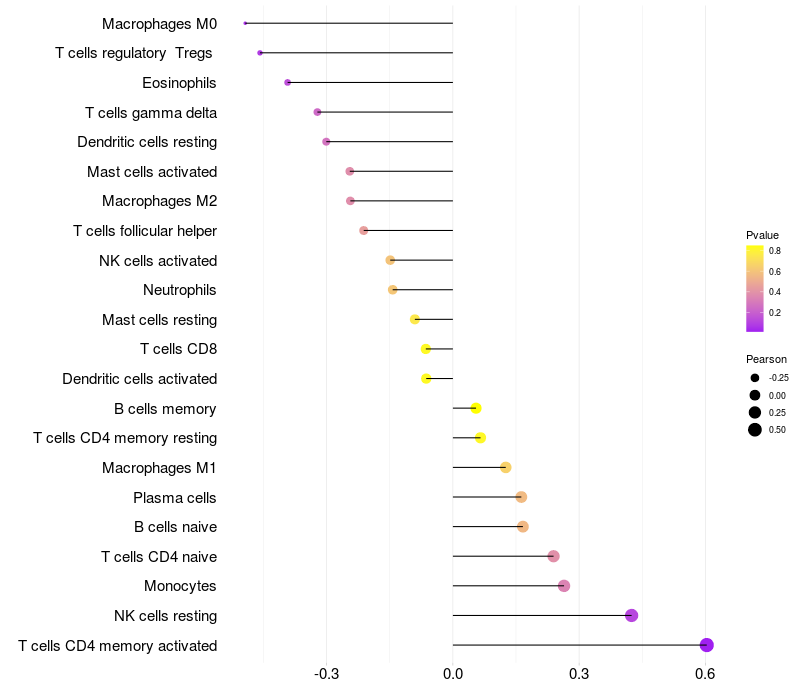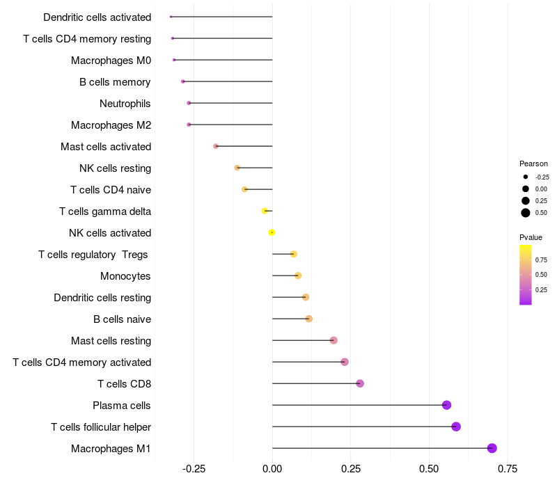 • Right: Correlation of target gene expression and the level of various types of immune cells in virus positive samples (Pearson Correlation Coefficient).