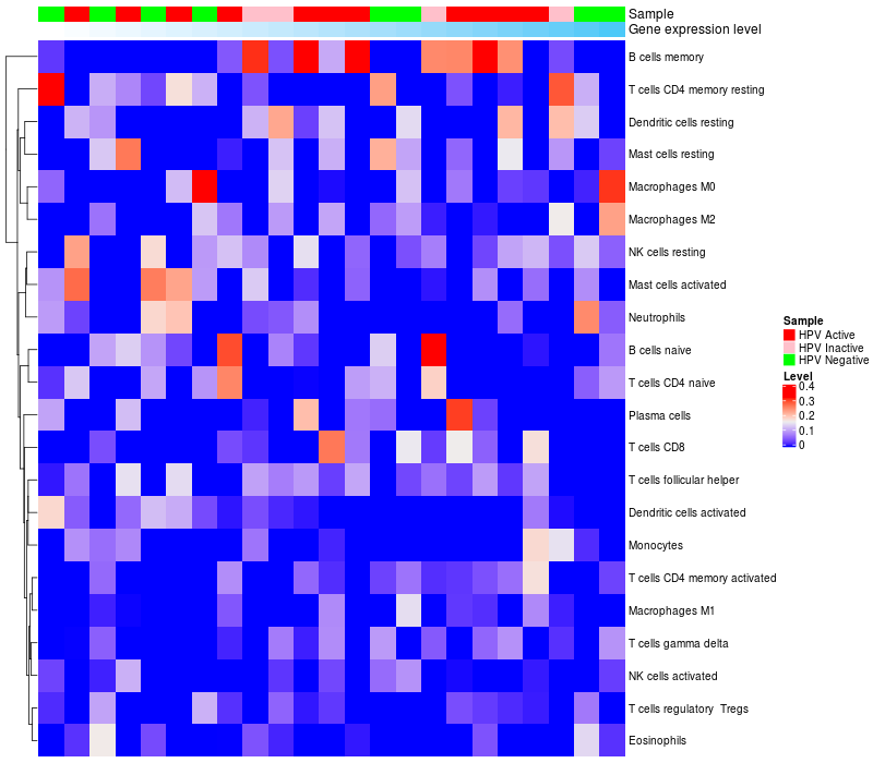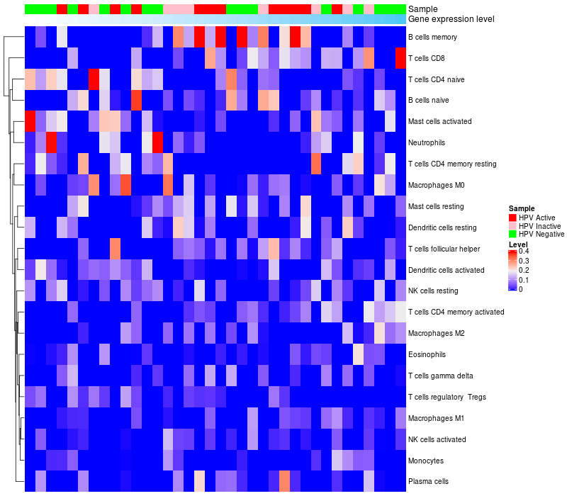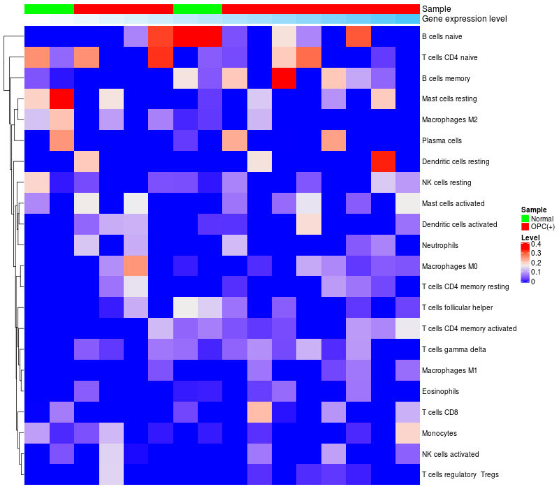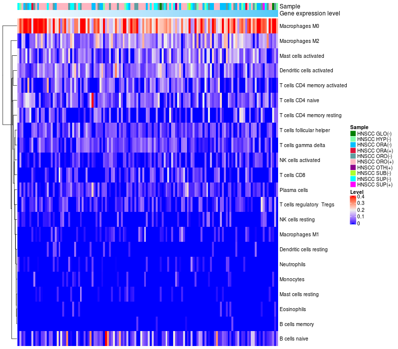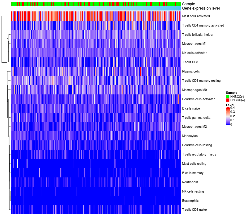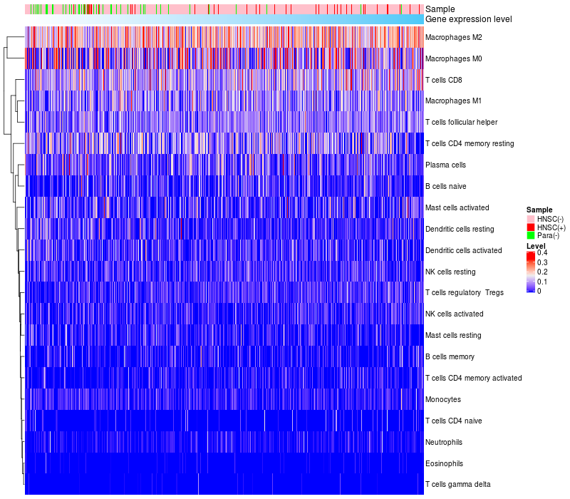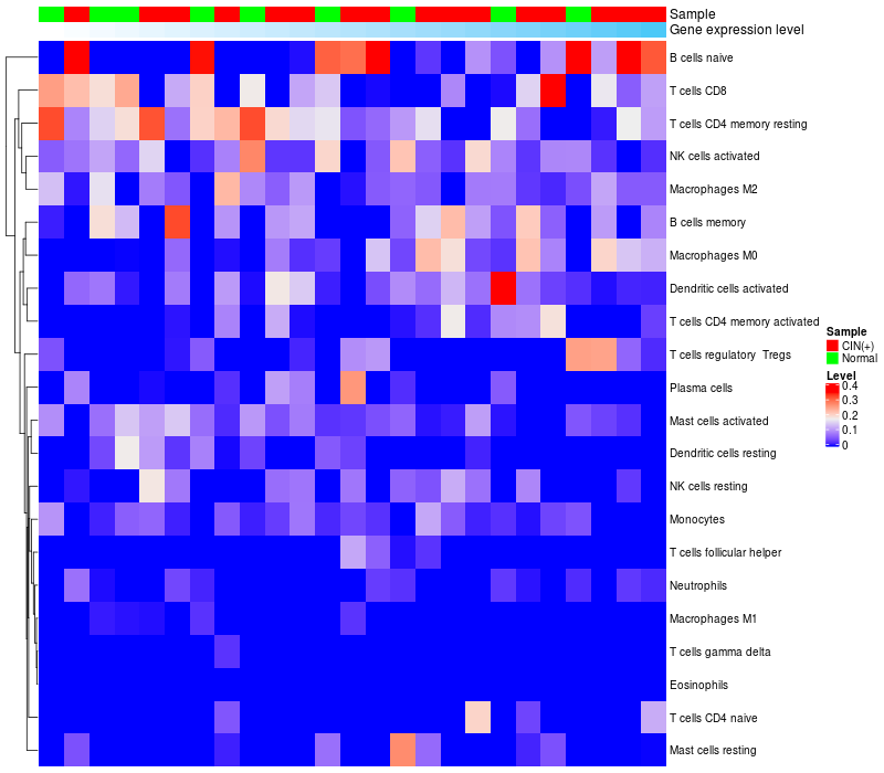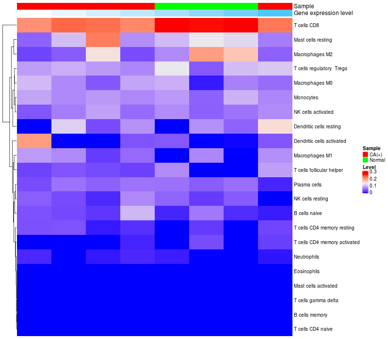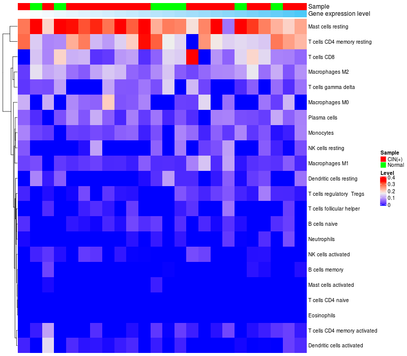• Left: Heatmap of target gene expression and the level of various types of immune cells (cell type fractions) in all samples based on CIBERSORT method.