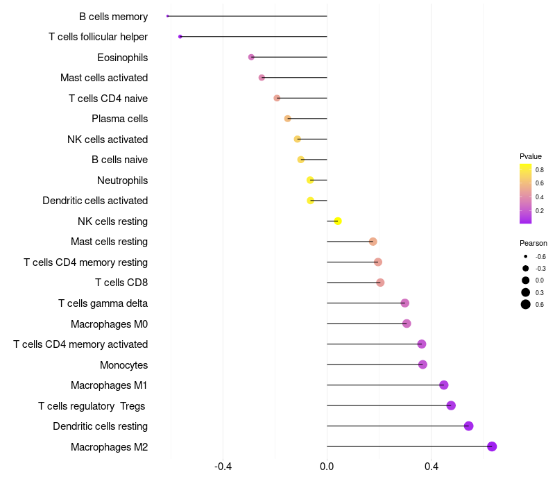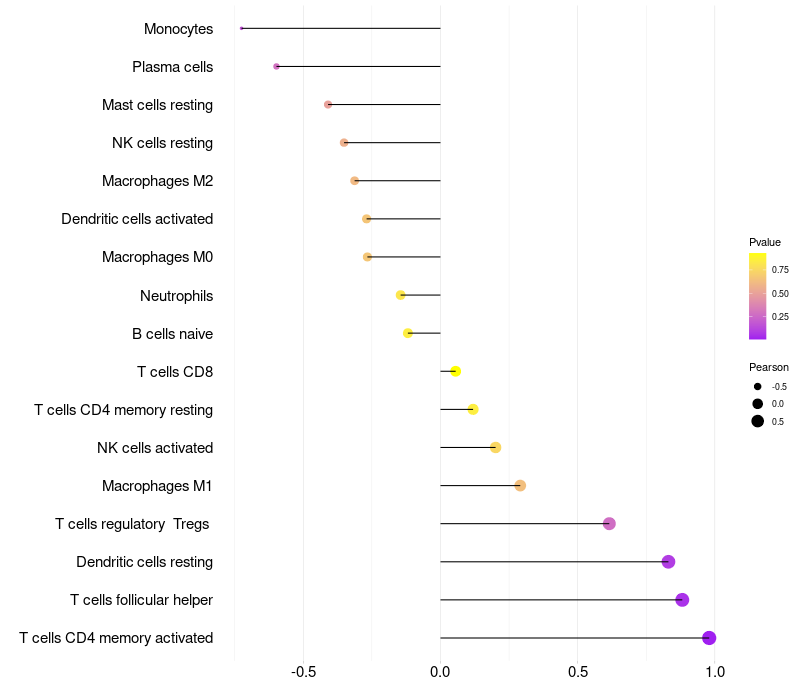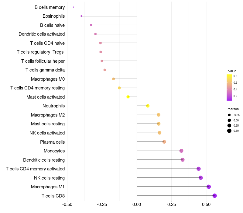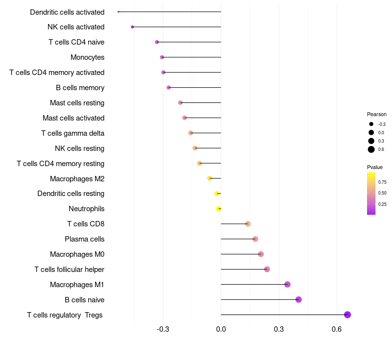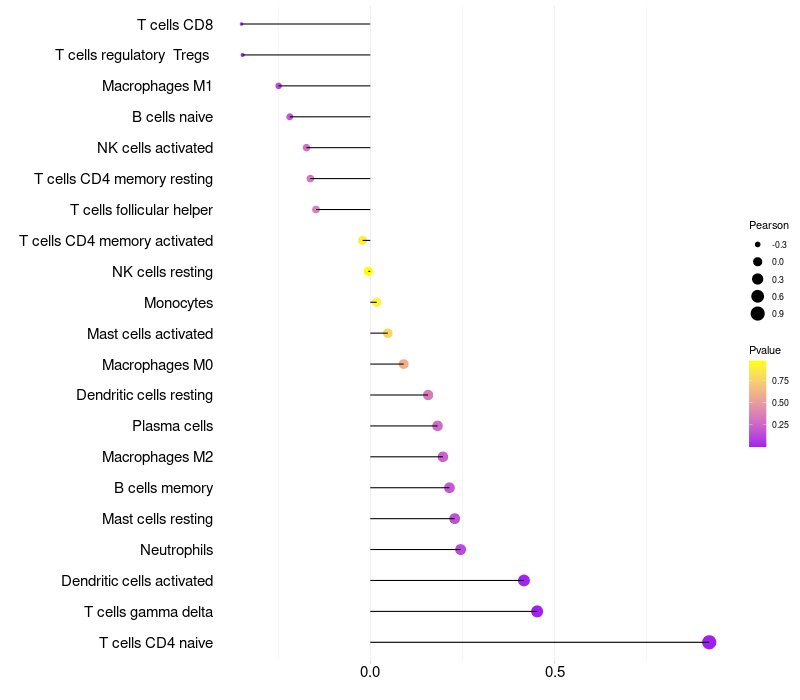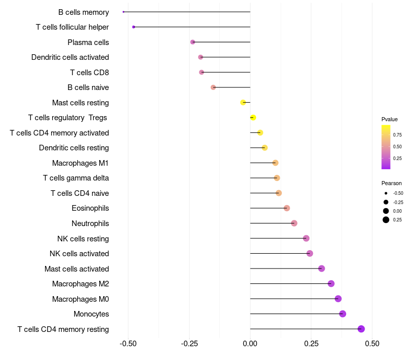 Lollipop of TRPM5 expression and immune infiltrating cell level correlation result in HPV+ samples