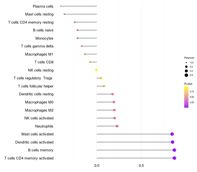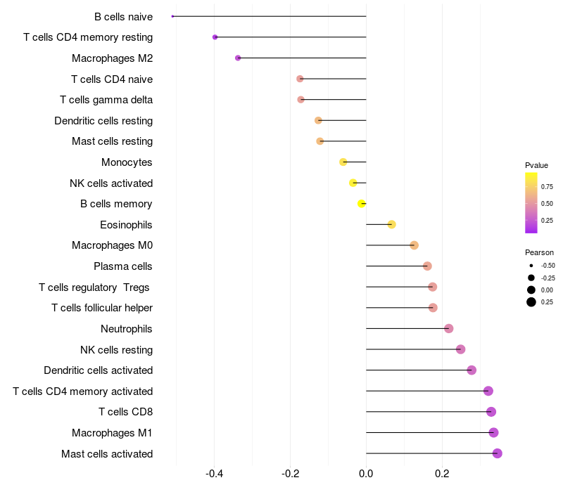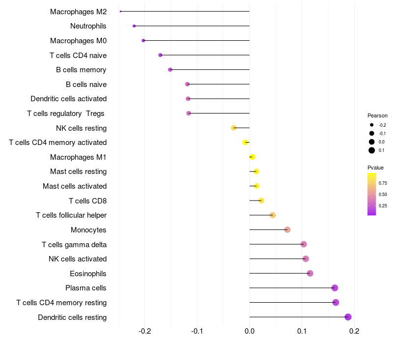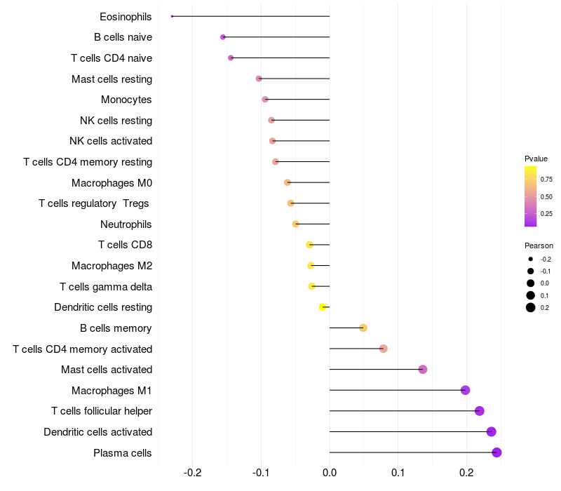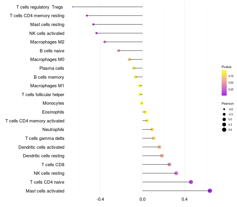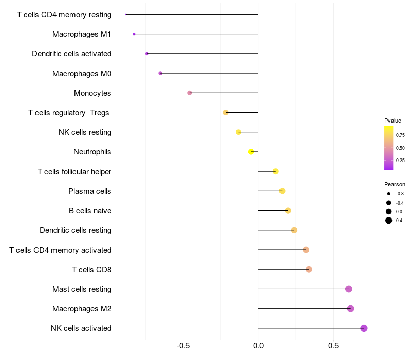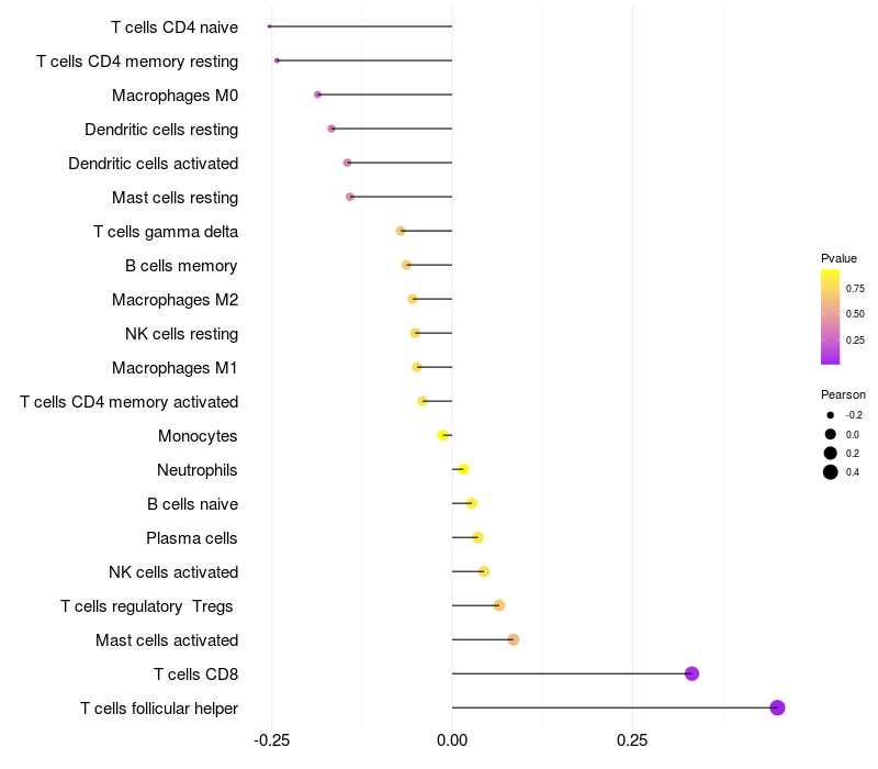 Lollipop of TRPV4 expression and immune infiltrating cell level correlation result in HPV+ samples