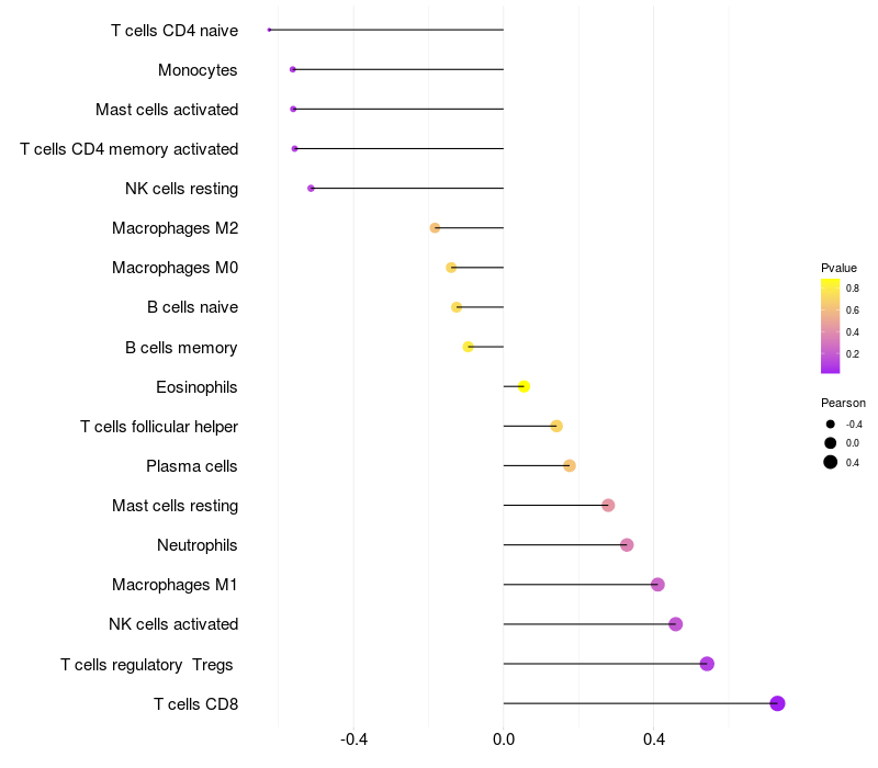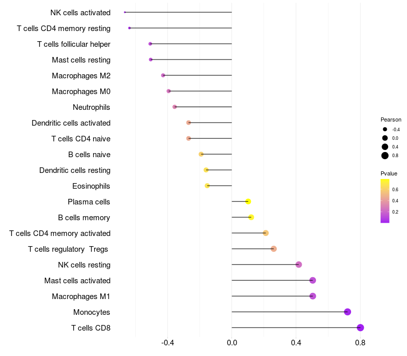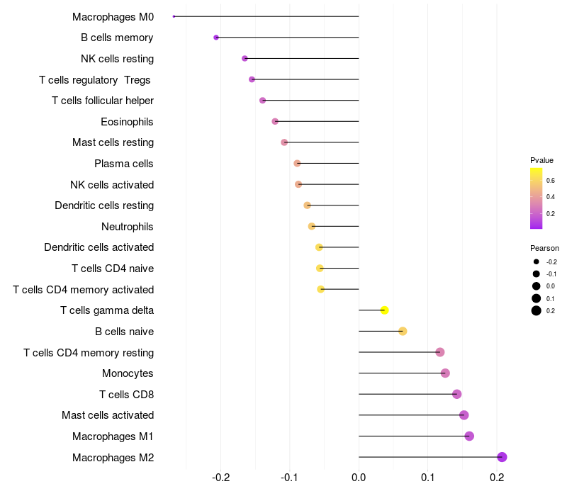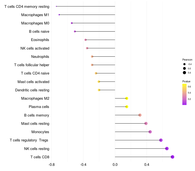 Lollipop of TSHZ2 expression and immune infiltrating cell level correlation result in HBV+ Liver cirrhosis samples
