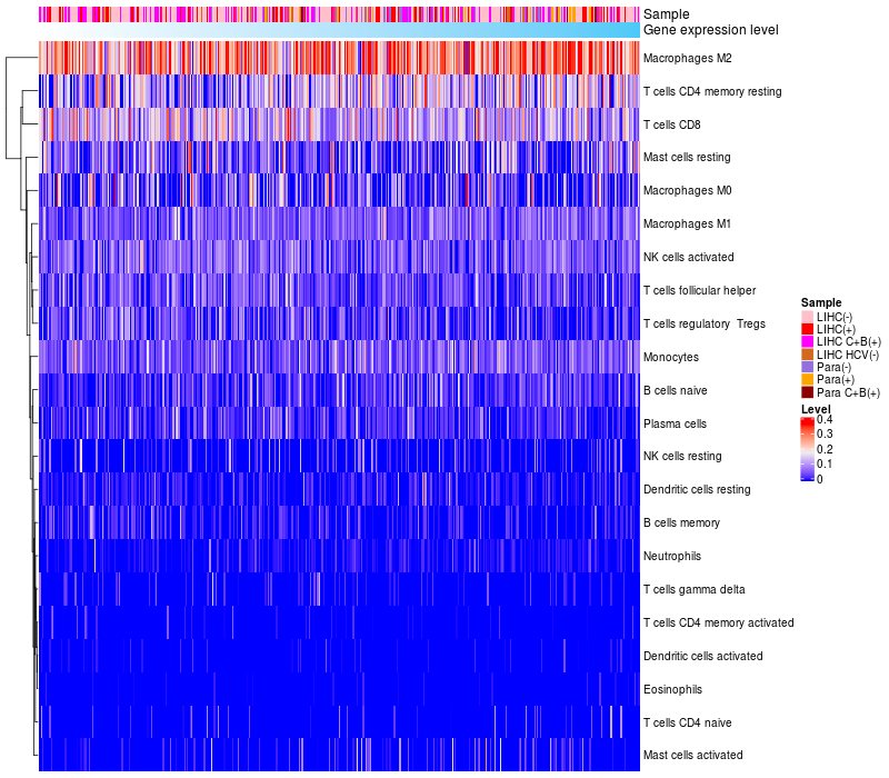 Liver hepatocellular carcinoma HCV (HBV+)(86), Liver hepatocellular carcinoma HCV (HBV-)(19), Liver hepatocellular carcinoma (HBV+)(209), Liver hepatocellular carcinoma (HBV+)(60), Paracancerous HCV (HBV+)(4), Paracancerous (HBV-)(28), Paracancerous (HBV+)(18) |