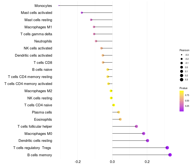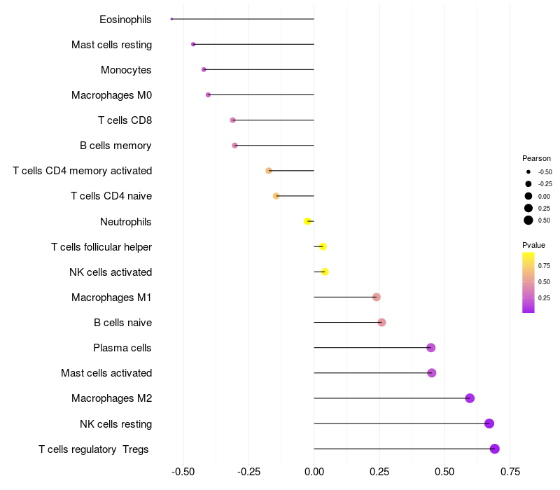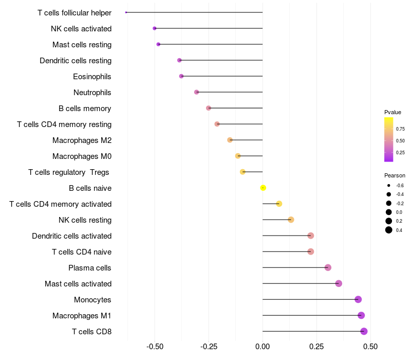 Lollipop of TSNARE1 expression and immune infiltrating cell level correlation result in HBV+ Chronic HBV (CHB) infection samples