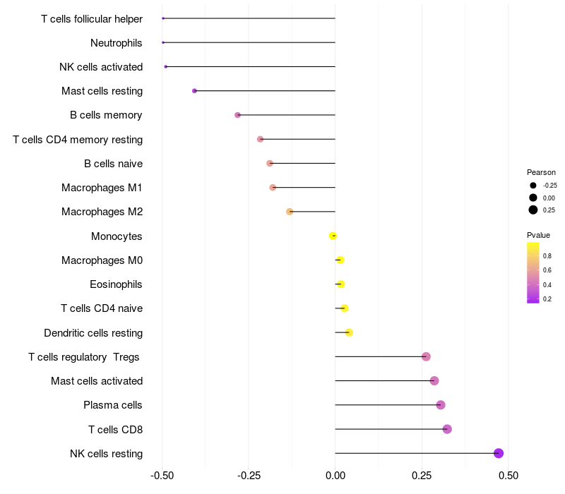 Lollipop of TSNARE1 expression and immune infiltrating cell level correlation result in HBV+ Liver cirrhosis samples