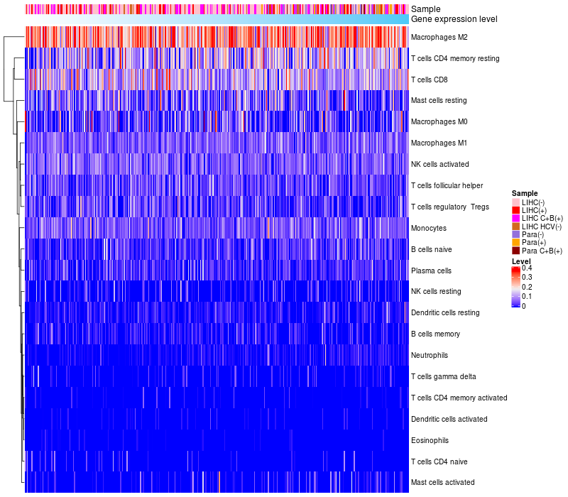 Liver hepatocellular carcinoma HCV (HBV+)(86), Liver hepatocellular carcinoma HCV (HBV-)(19), Liver hepatocellular carcinoma (HBV+)(209), Liver hepatocellular carcinoma (HBV+)(60), Paracancerous HCV (HBV+)(4), Paracancerous (HBV-)(28), Paracancerous (HBV+)(18) |