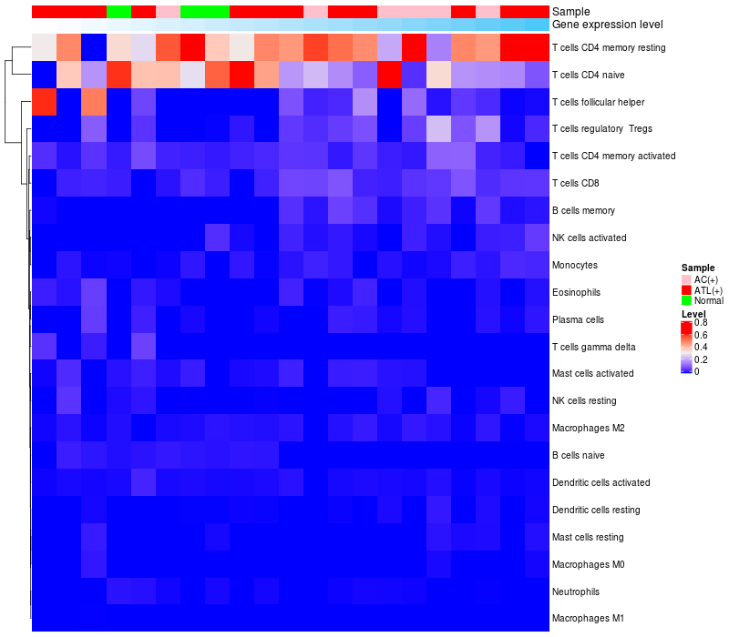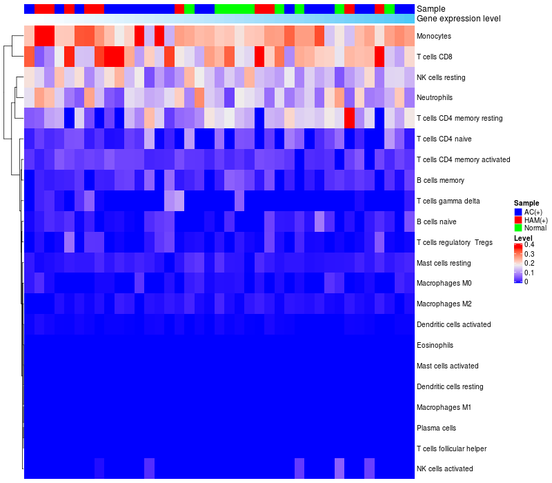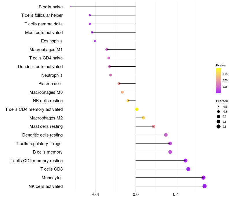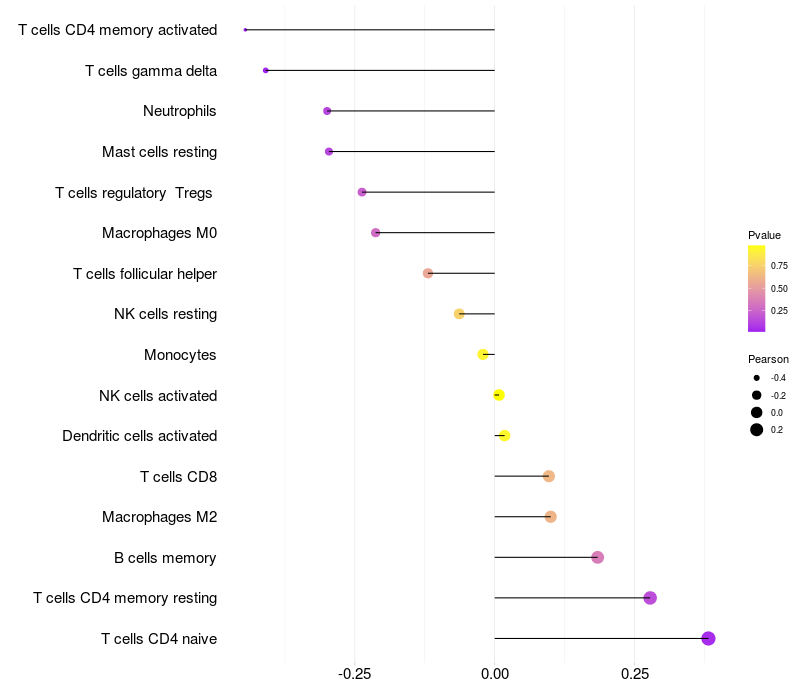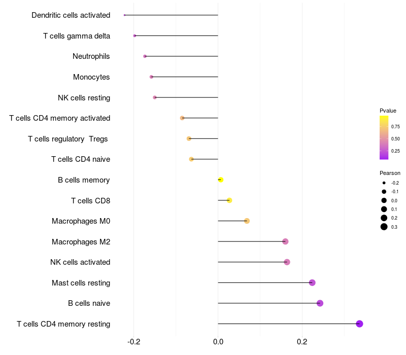 Lollipop of TSPAN18 expression and immune infiltrating cell level correlation result in HTLV1+ samples