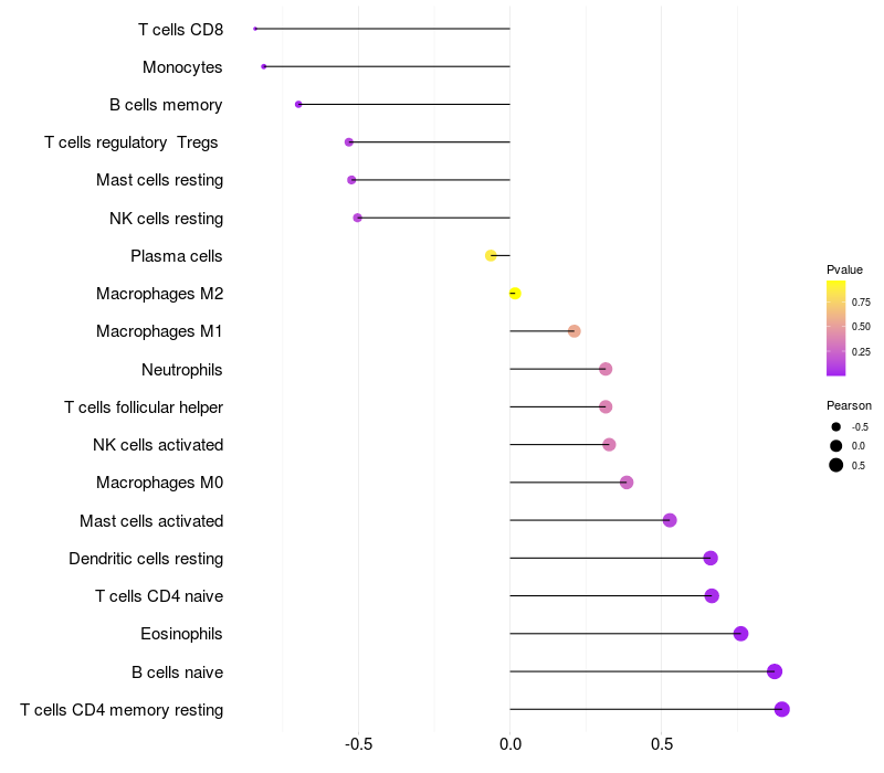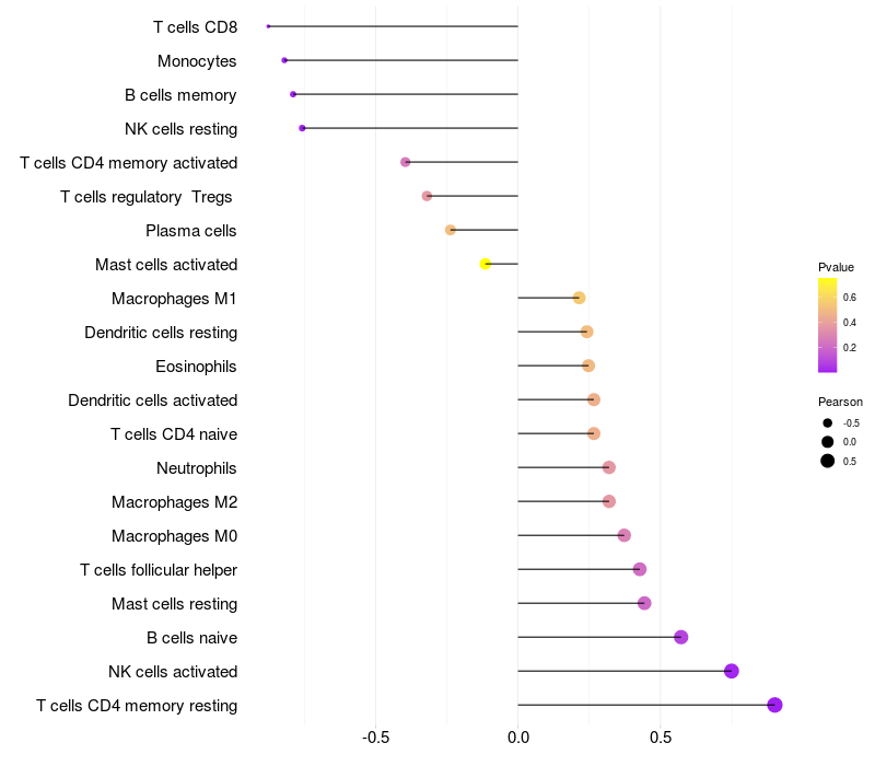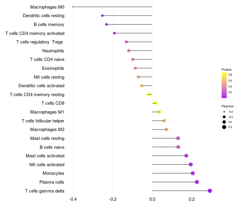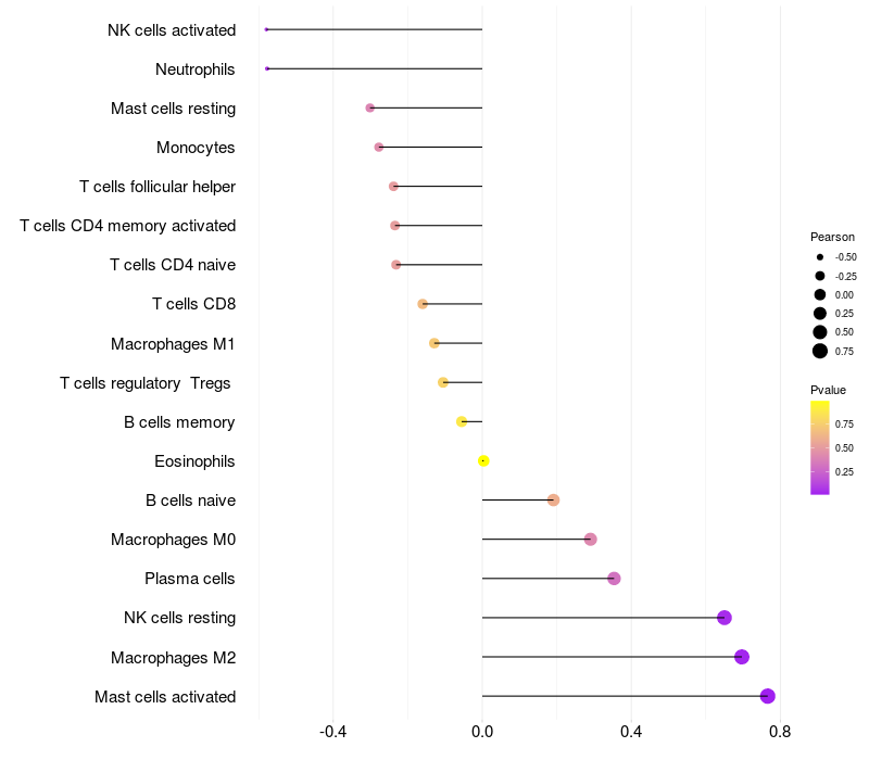 Lollipop of TSPAN9 expression and immune infiltrating cell level correlation result in HBV+ Liver cirrhosis samples