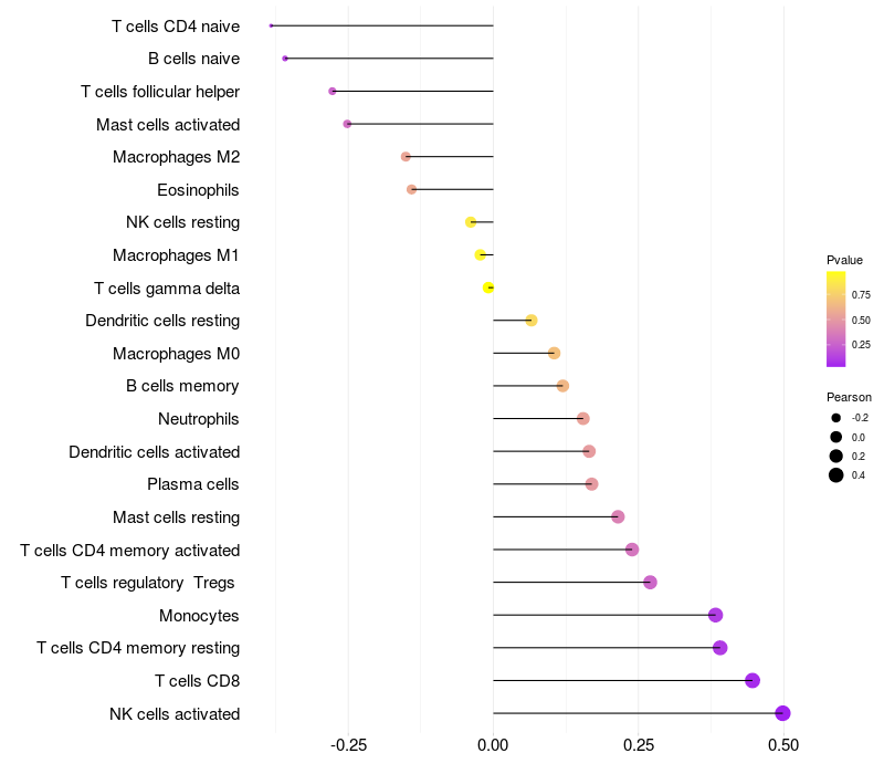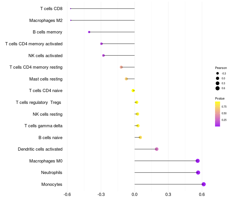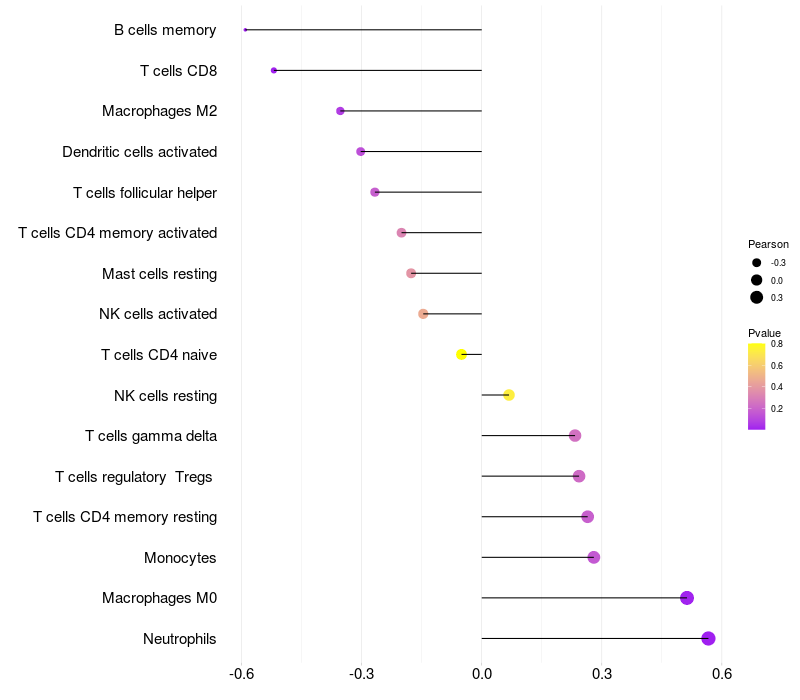 Lollipop of TST expression and immune infiltrating cell level correlation result in HTLV1+ samples