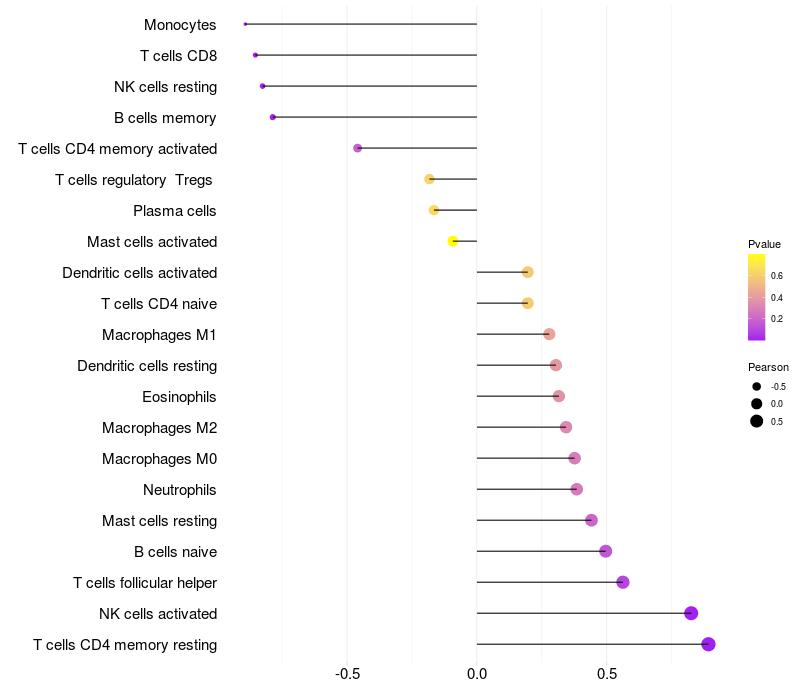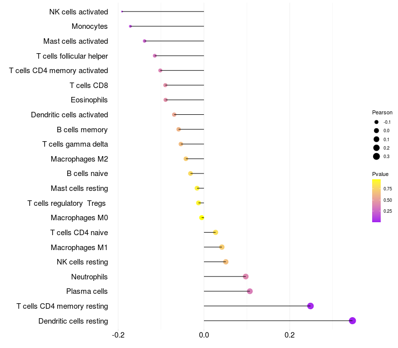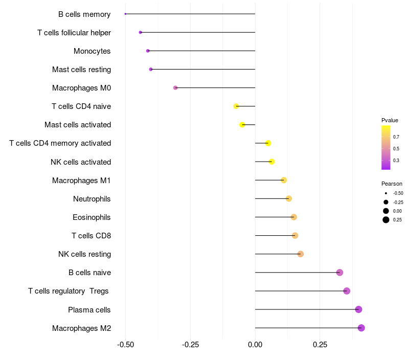 Lollipop of TTC23 expression and immune infiltrating cell level correlation result in HBV+ Chronic HBV (CHB) infection samples