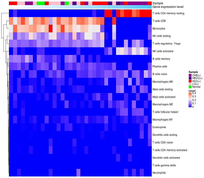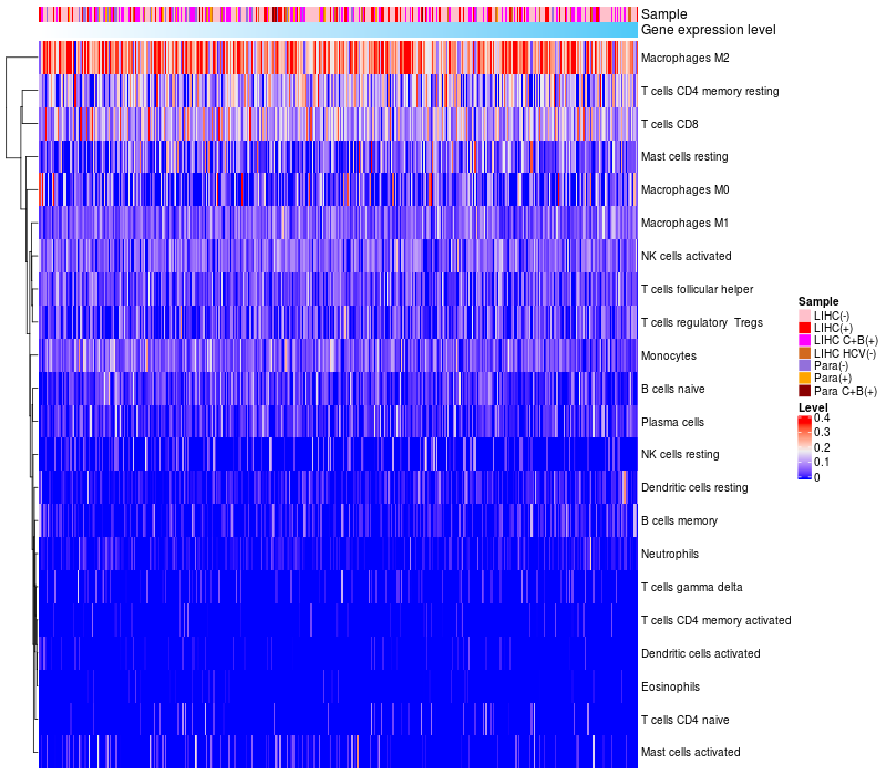 Liver hepatocellular carcinoma HCV (HBV+)(86), Liver hepatocellular carcinoma HCV (HBV-)(19), Liver hepatocellular carcinoma (HBV+)(209), Liver hepatocellular carcinoma (HBV+)(60), Paracancerous HCV (HBV+)(4), Paracancerous (HBV-)(28), Paracancerous (HBV+)(18) |