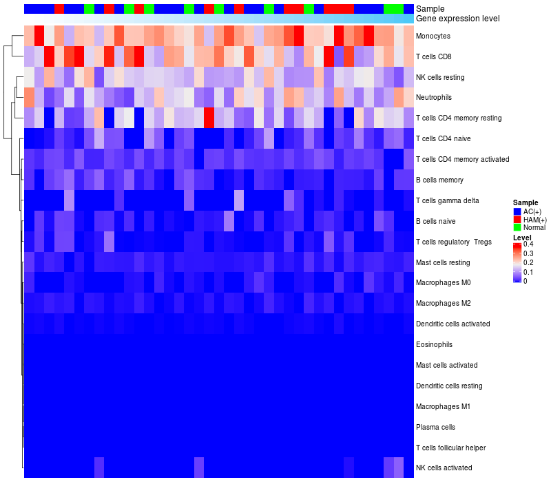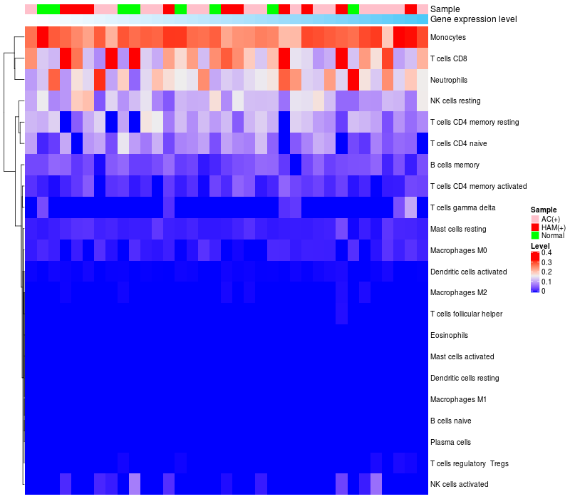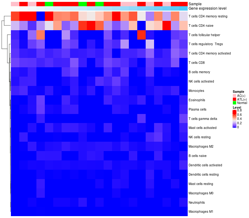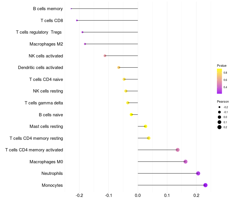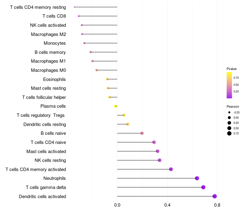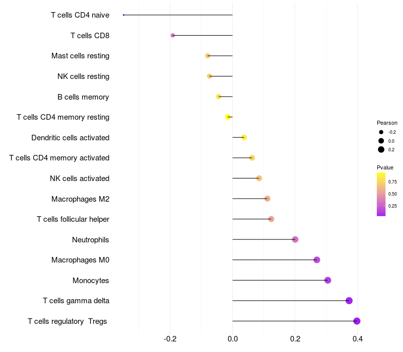 Lollipop of TTC32 expression and immune infiltrating cell level correlation result in HTLV1+ samples