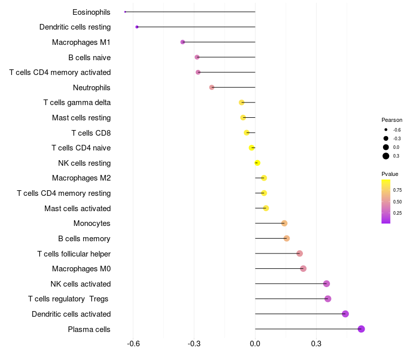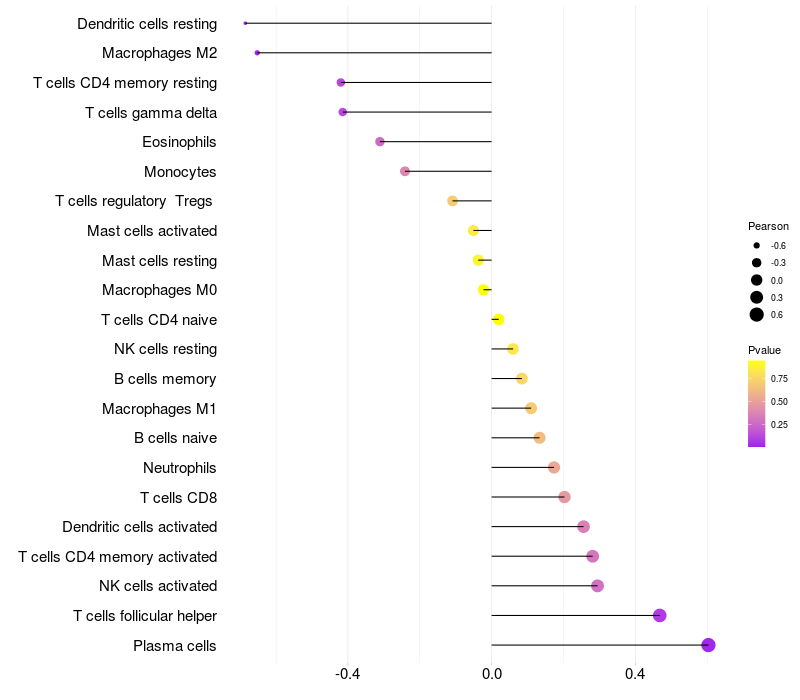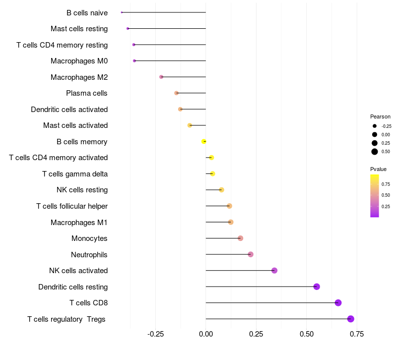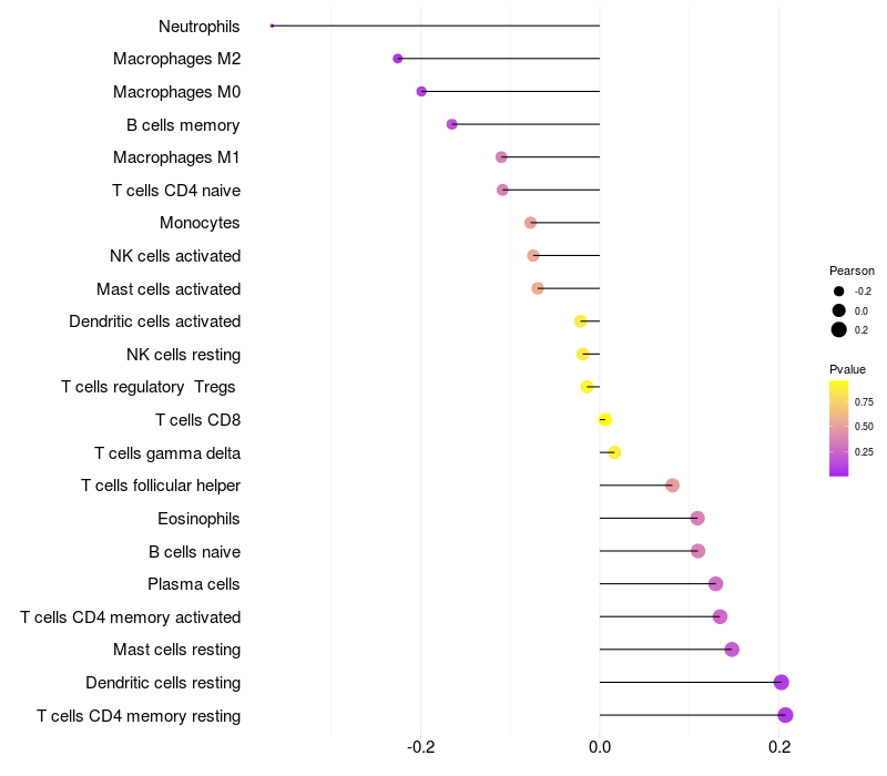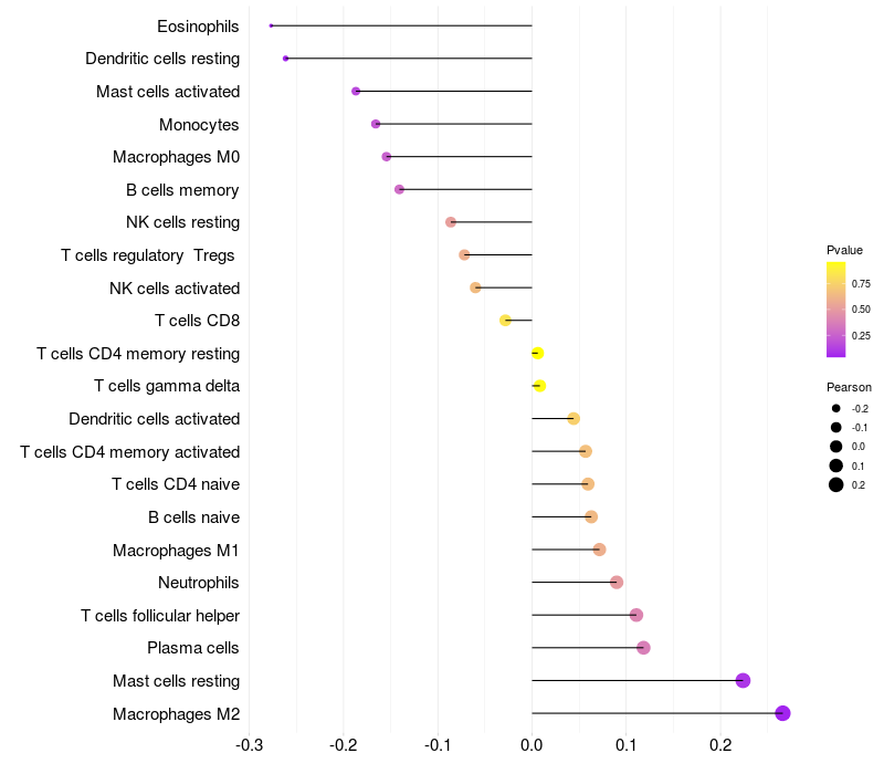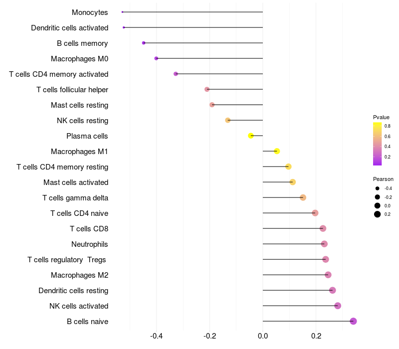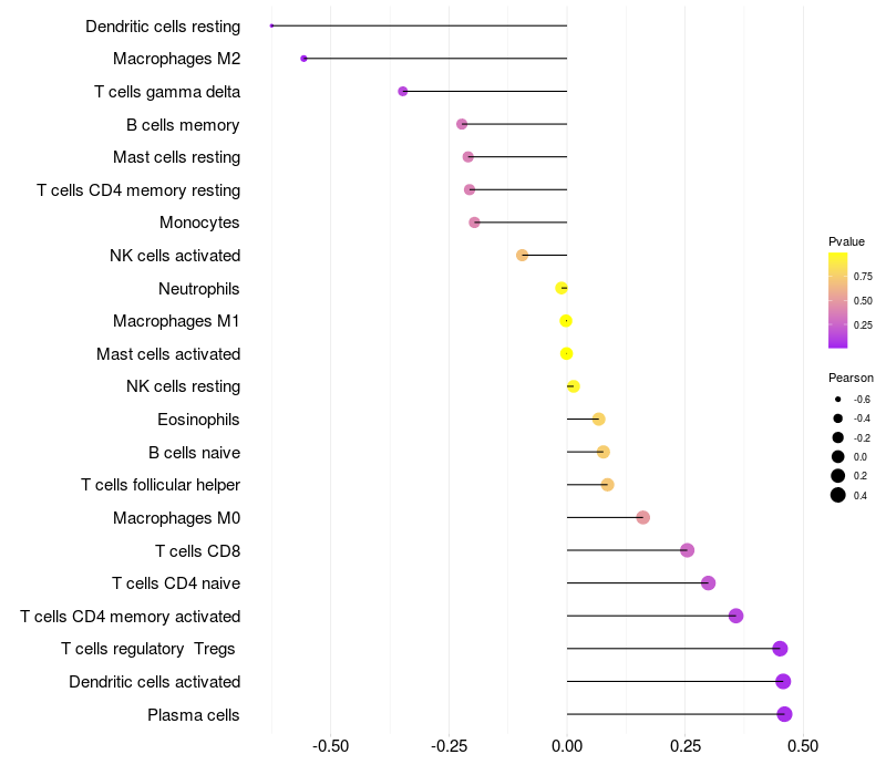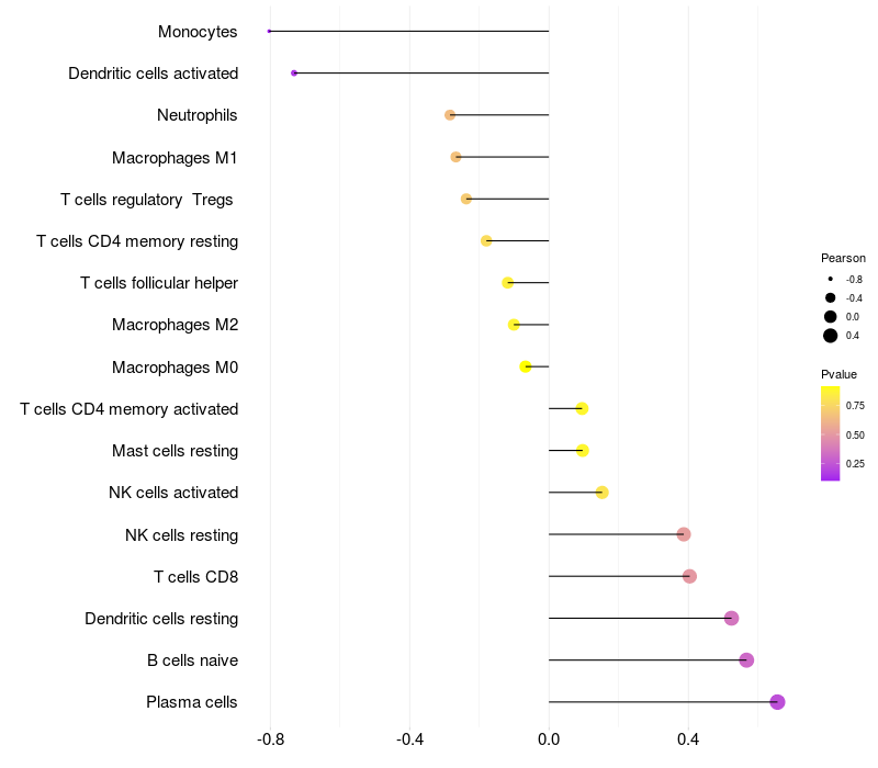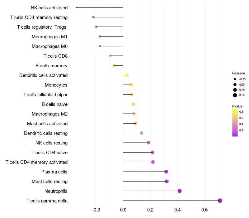 Lollipop of TUBD1 expression and immune infiltrating cell level correlation result in HPV+ samples