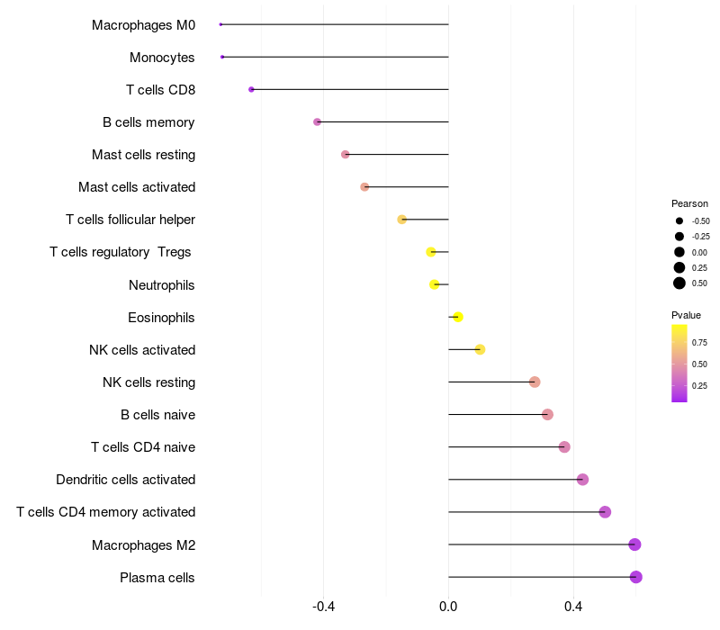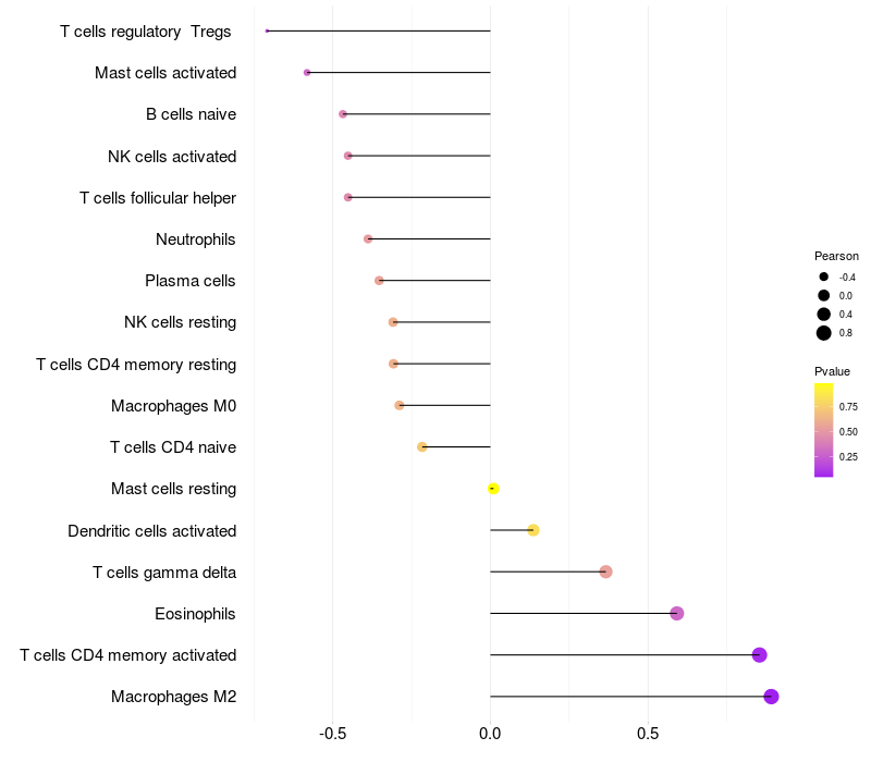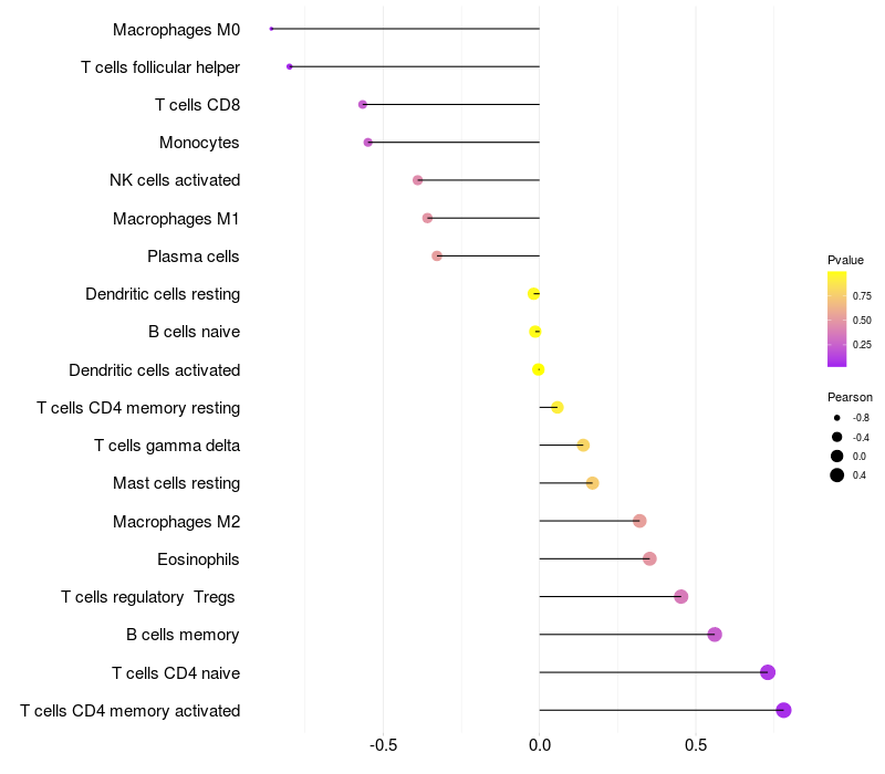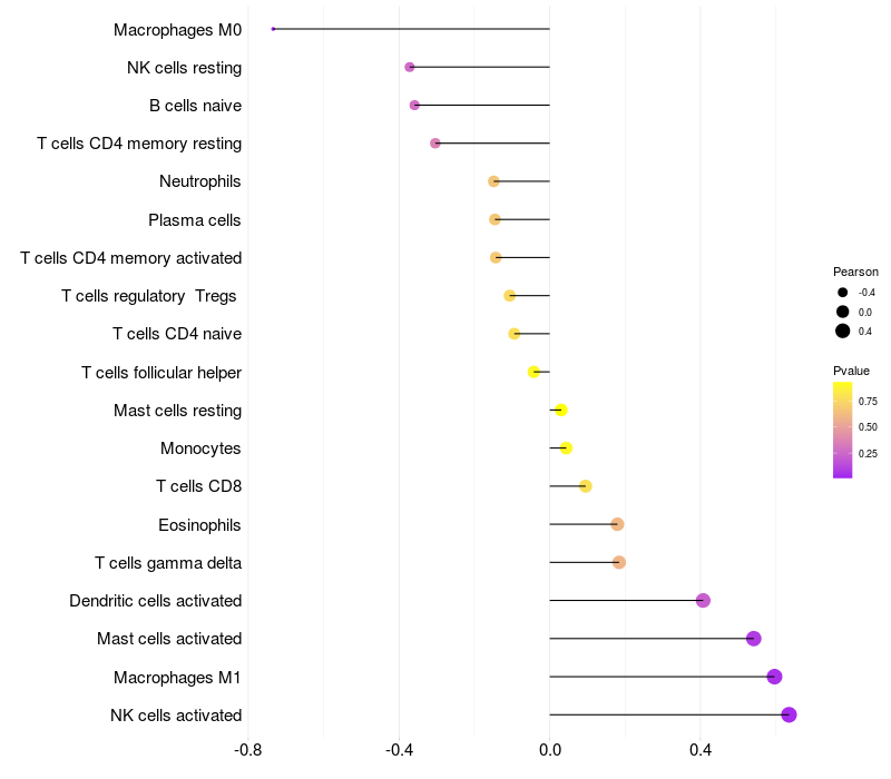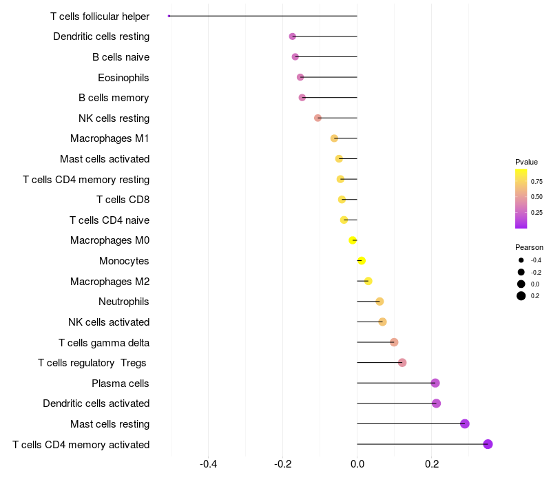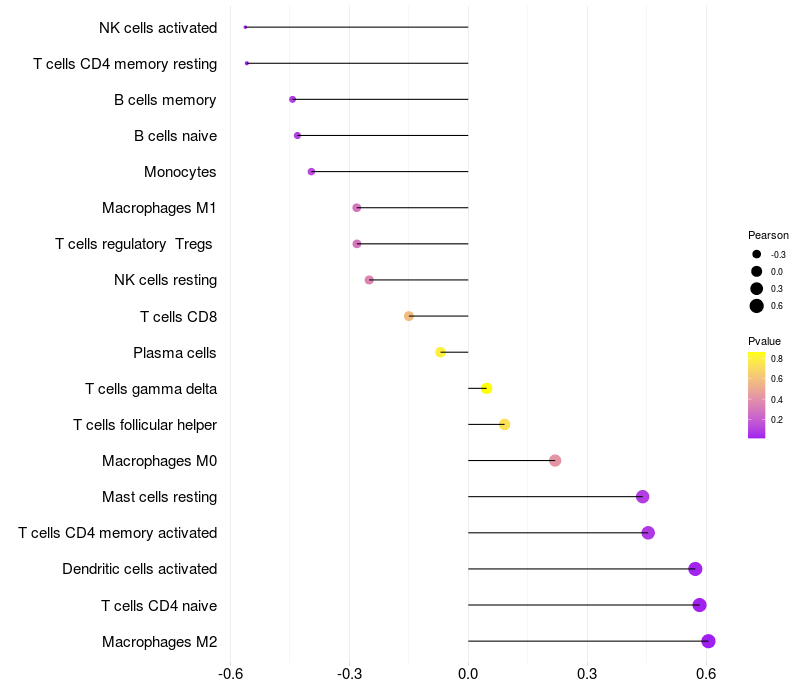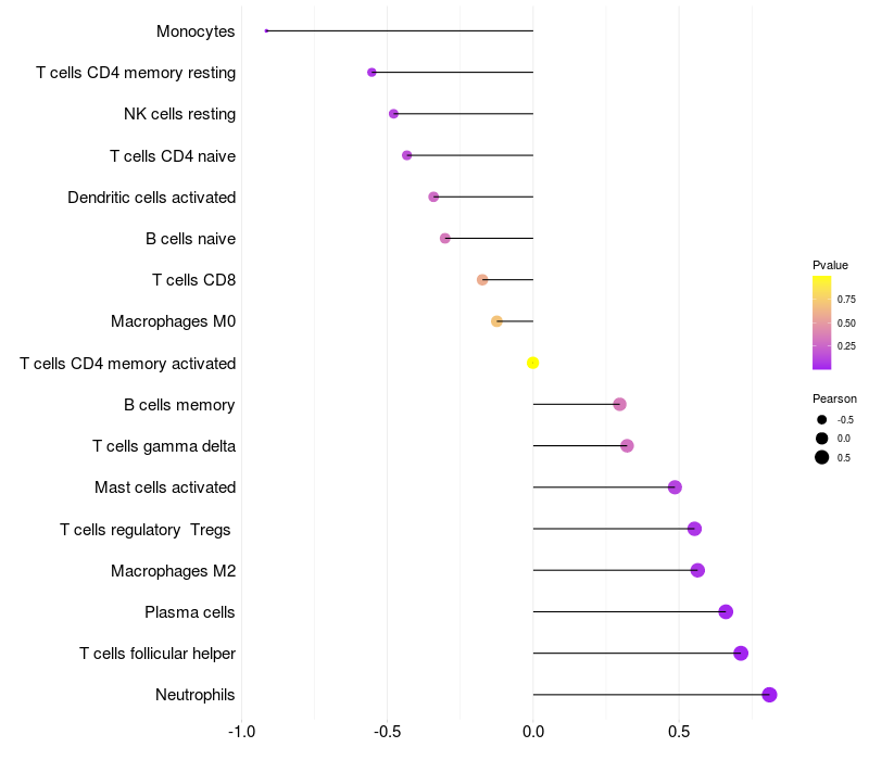 Lollipop of TUBGCP5 expression and immune infiltrating cell level correlation result in EBV+ samples