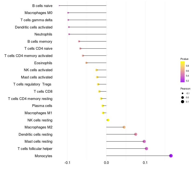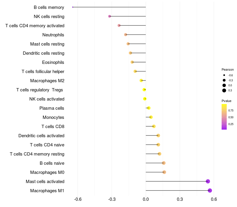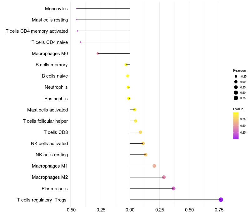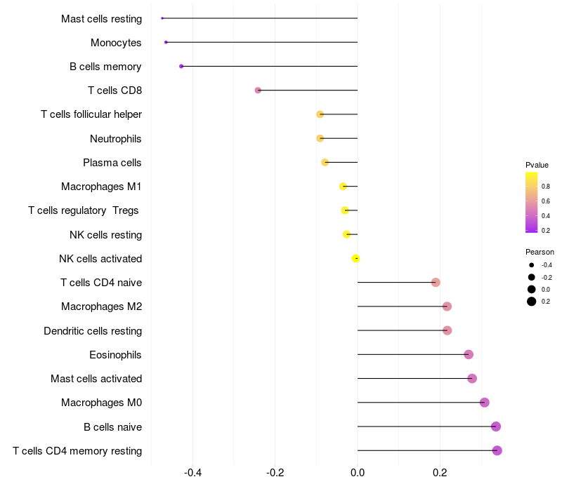 Lollipop of TULP2 expression and immune infiltrating cell level correlation result in HBV+ Liver cirrhosis samples