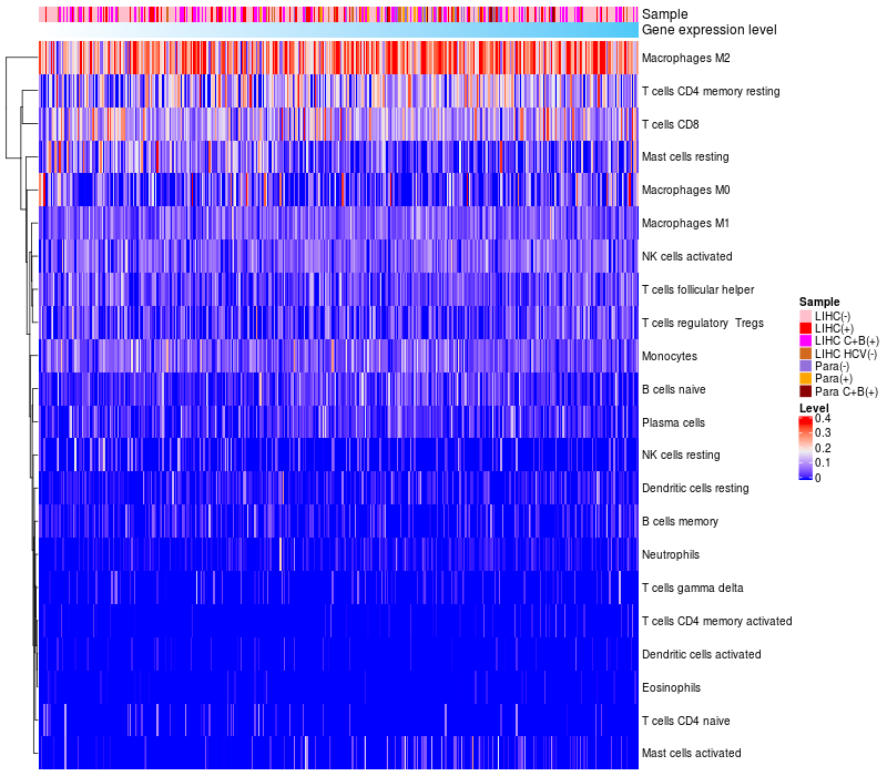 Liver hepatocellular carcinoma HCV (HBV+)(86), Liver hepatocellular carcinoma HCV (HBV-)(19), Liver hepatocellular carcinoma (HBV+)(209), Liver hepatocellular carcinoma (HBV+)(60), Paracancerous HCV (HBV+)(4), Paracancerous (HBV-)(28), Paracancerous (HBV+)(18) |