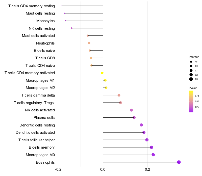Lollipop of TUSC3 expression and immune infiltrating cell level correlation result in HBV+ samples