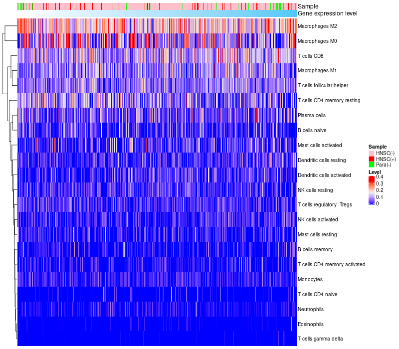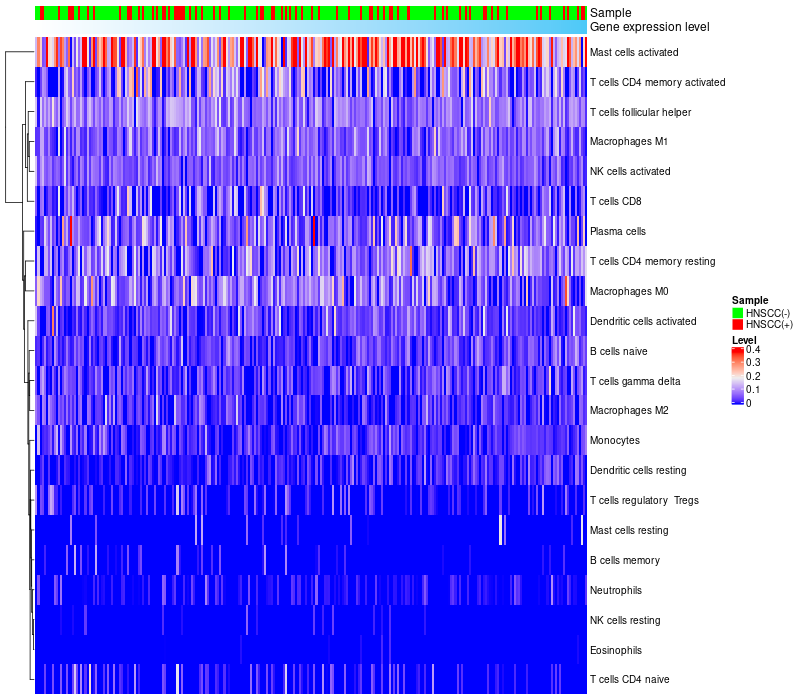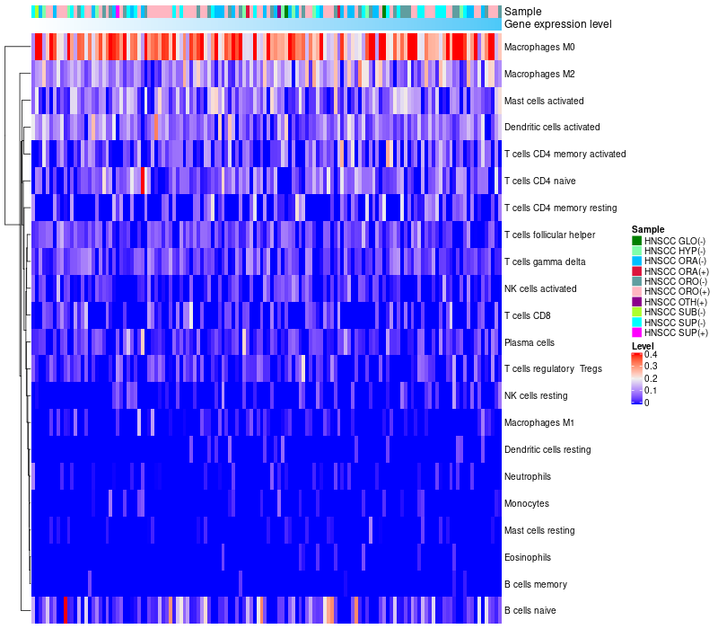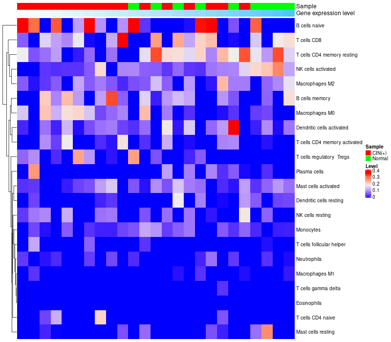 • Left: Heatmap of target gene expression and the level of various types of immune cells (cell type fractions) in all samples based on CIBERSORT method.