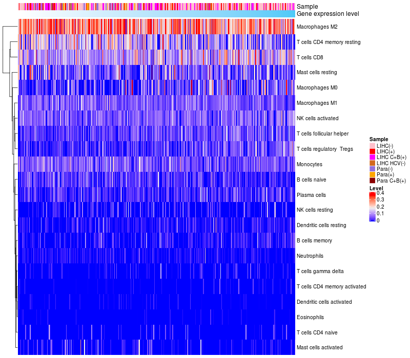 Liver hepatocellular carcinoma HCV (HBV+)(86), Liver hepatocellular carcinoma HCV (HBV-)(19), Liver hepatocellular carcinoma (HBV+)(209), Liver hepatocellular carcinoma (HBV+)(60), Paracancerous HCV (HBV+)(4), Paracancerous (HBV-)(28), Paracancerous (HBV+)(18) |