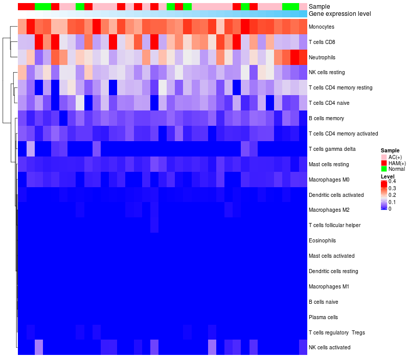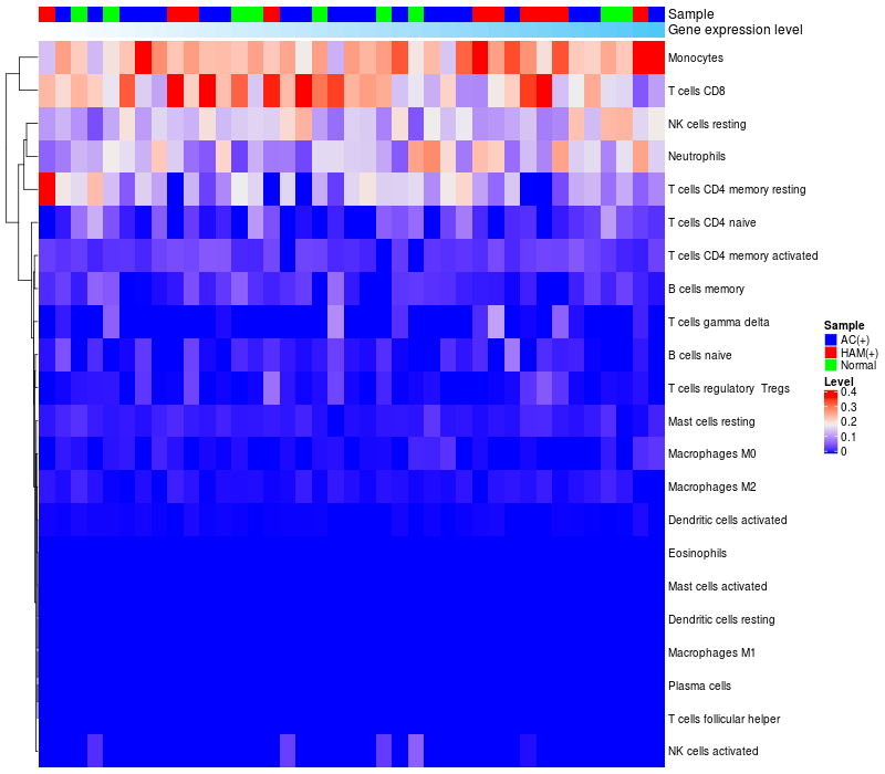 Normal (8), Asymptomatic carriers (HTLV1+)(17), HTLV-1-associated myelopathy (HTLV1+)(10) |