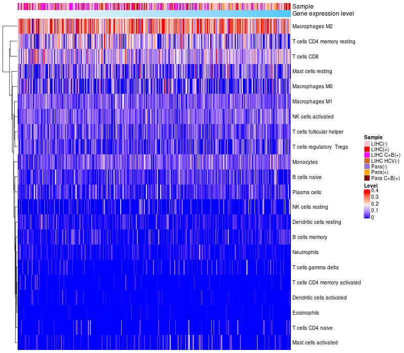 Liver hepatocellular carcinoma HCV (HBV+)(86), Liver hepatocellular carcinoma HCV (HBV-)(19), Liver hepatocellular carcinoma (HBV+)(209), Liver hepatocellular carcinoma (HBV+)(60), Paracancerous HCV (HBV+)(4), Paracancerous (HBV-)(28), Paracancerous (HBV+)(18) |