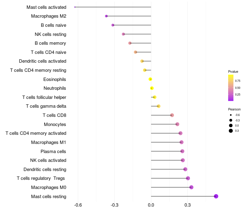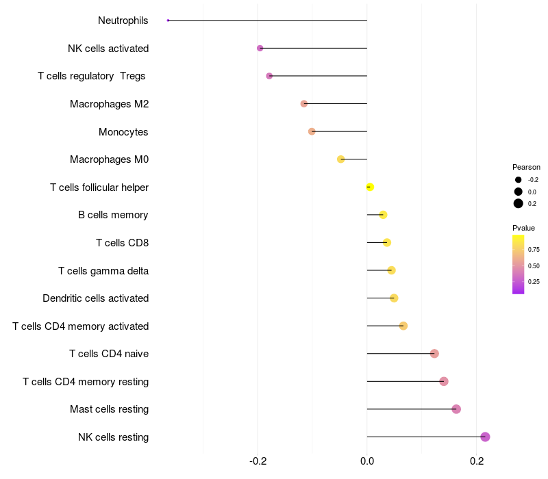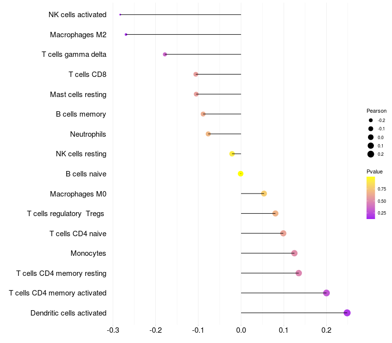 Lollipop of TYRO3 expression and immune infiltrating cell level correlation result in HTLV1+ samples