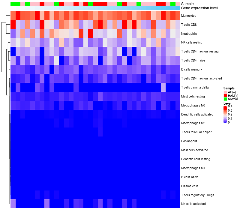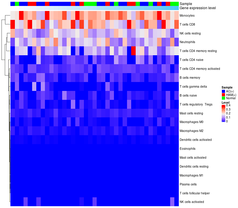 Normal (8), Asymptomatic carriers (HTLV1+)(17), HTLV-1-associated myelopathy (HTLV1+)(10) |