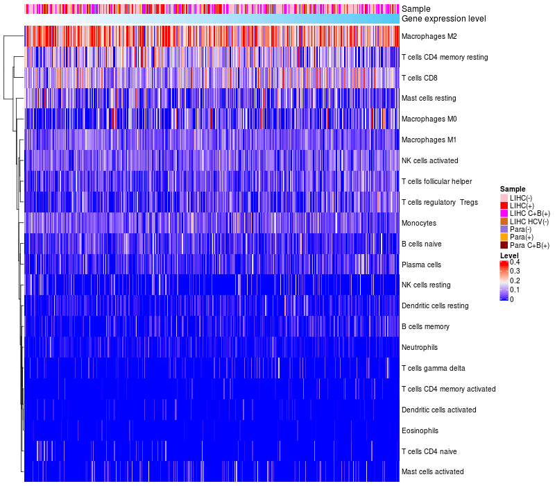 Liver hepatocellular carcinoma HCV (HBV+)(86), Liver hepatocellular carcinoma HCV (HBV-)(19), Liver hepatocellular carcinoma (HBV+)(209), Liver hepatocellular carcinoma (HBV+)(60), Paracancerous HCV (HBV+)(4), Paracancerous (HBV-)(28), Paracancerous (HBV+)(18) |