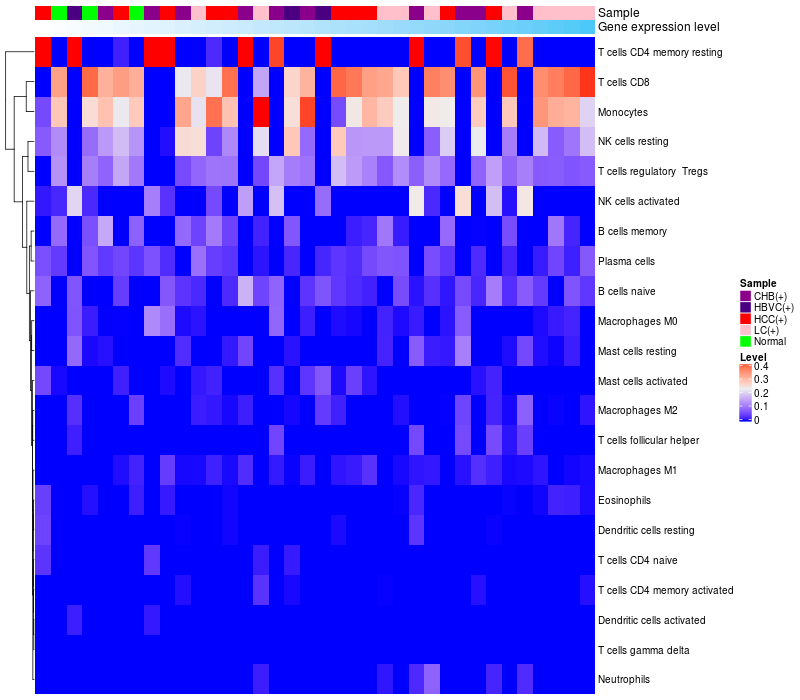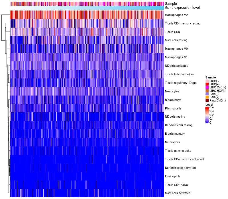 Liver hepatocellular carcinoma HCV (HBV+)(86), Liver hepatocellular carcinoma HCV (HBV-)(19), Liver hepatocellular carcinoma (HBV+)(209), Liver hepatocellular carcinoma (HBV+)(60), Paracancerous HCV (HBV+)(4), Paracancerous (HBV-)(28), Paracancerous (HBV+)(18) |