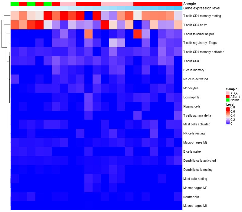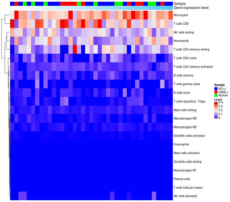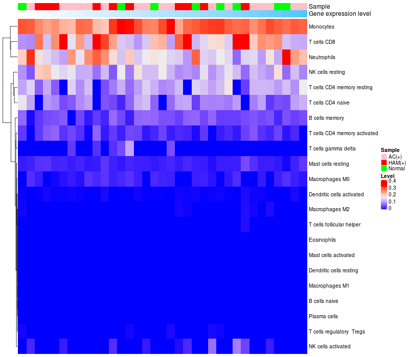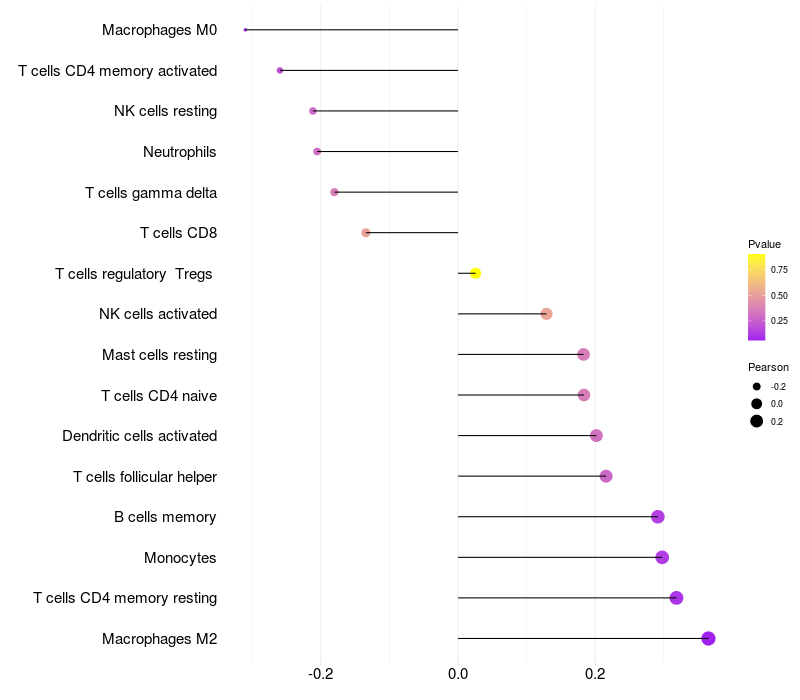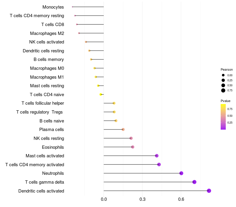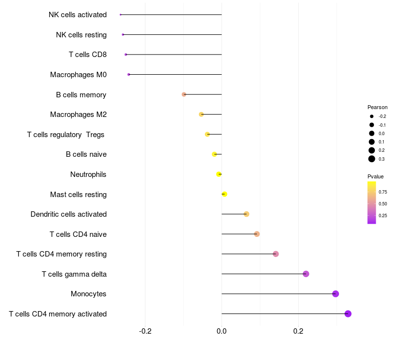 Lollipop of UBE2D1 expression and immune infiltrating cell level correlation result in HTLV1+ samples