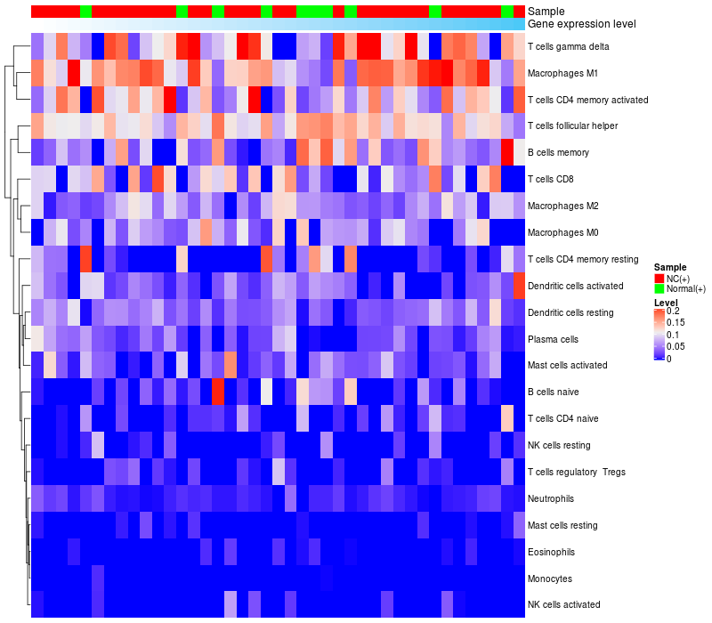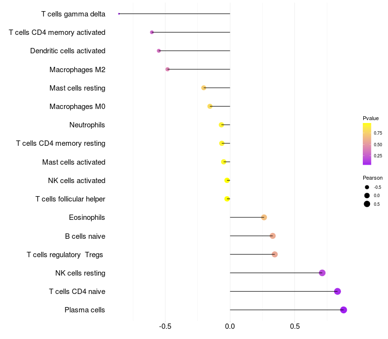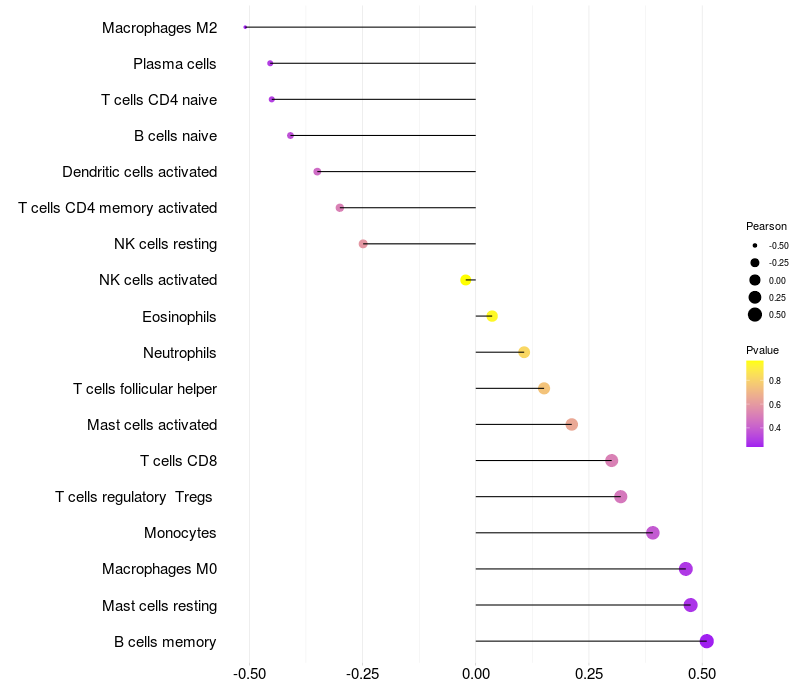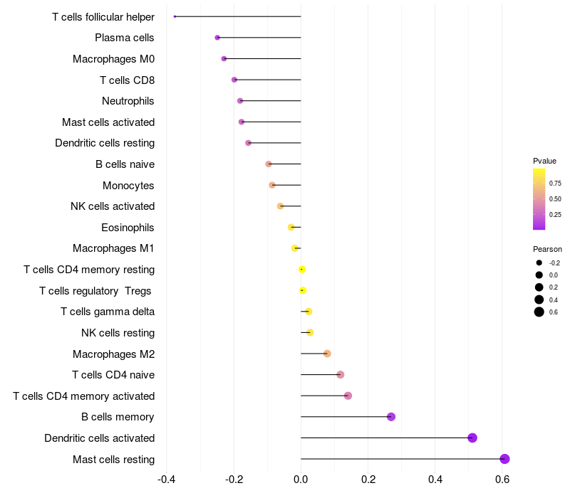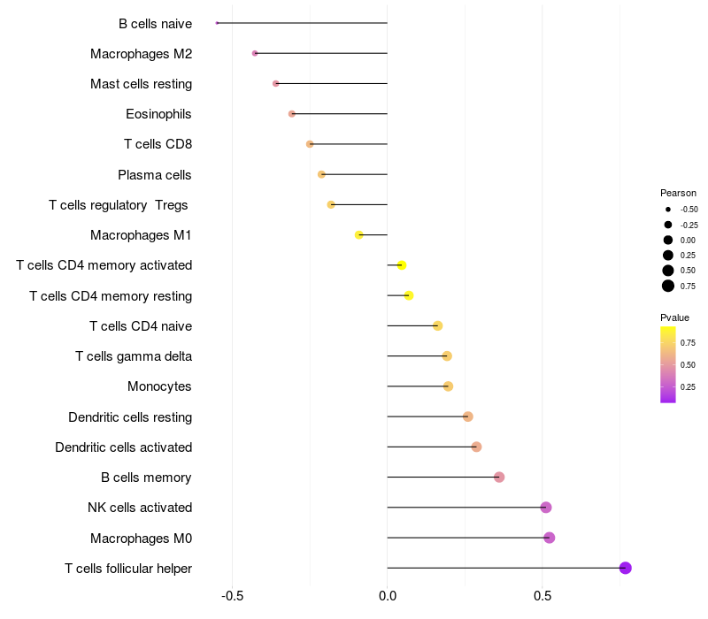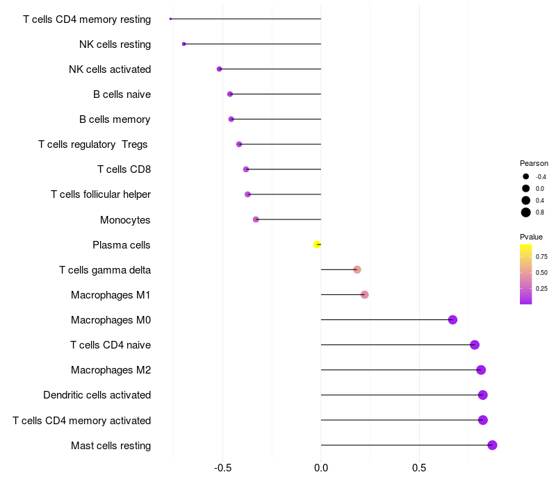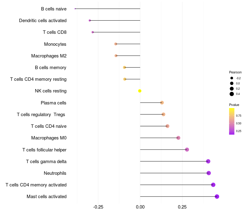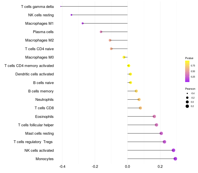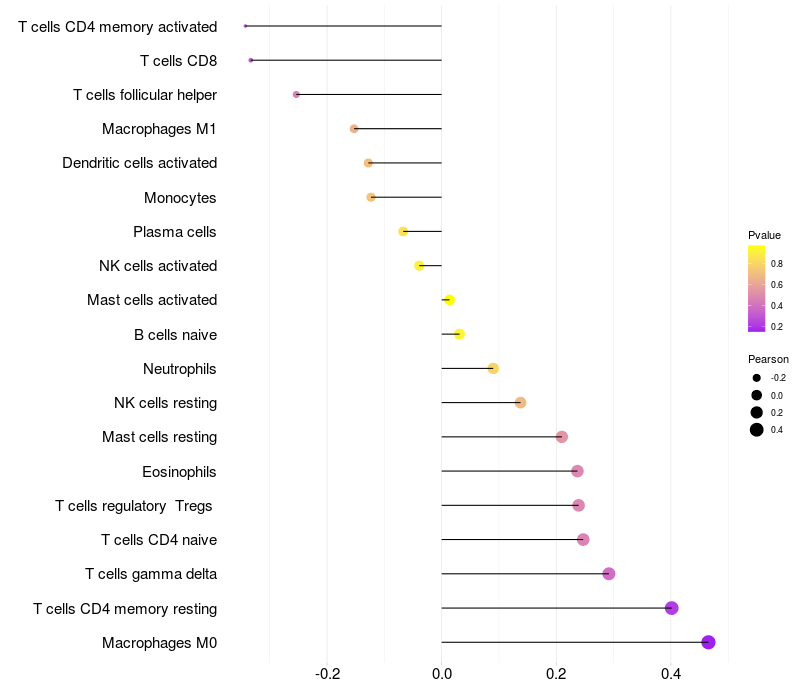 Lollipop of UNC13C expression and immune infiltrating cell level correlation result in EBV+ samples