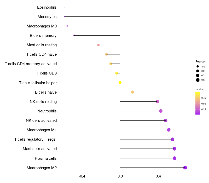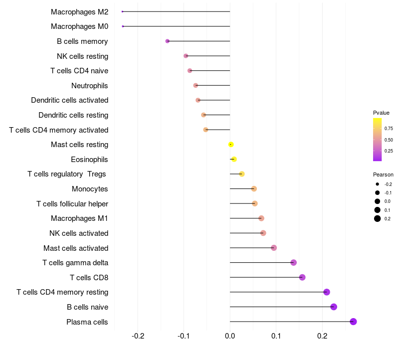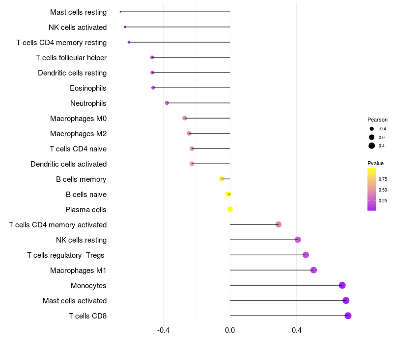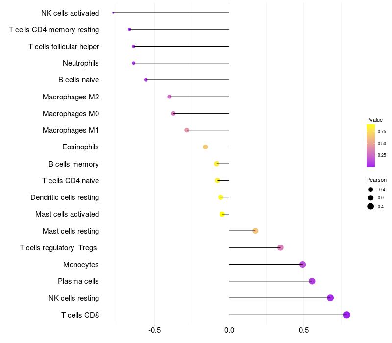 Lollipop of UNC45B expression and immune infiltrating cell level correlation result in HBV+ Liver cirrhosis samples