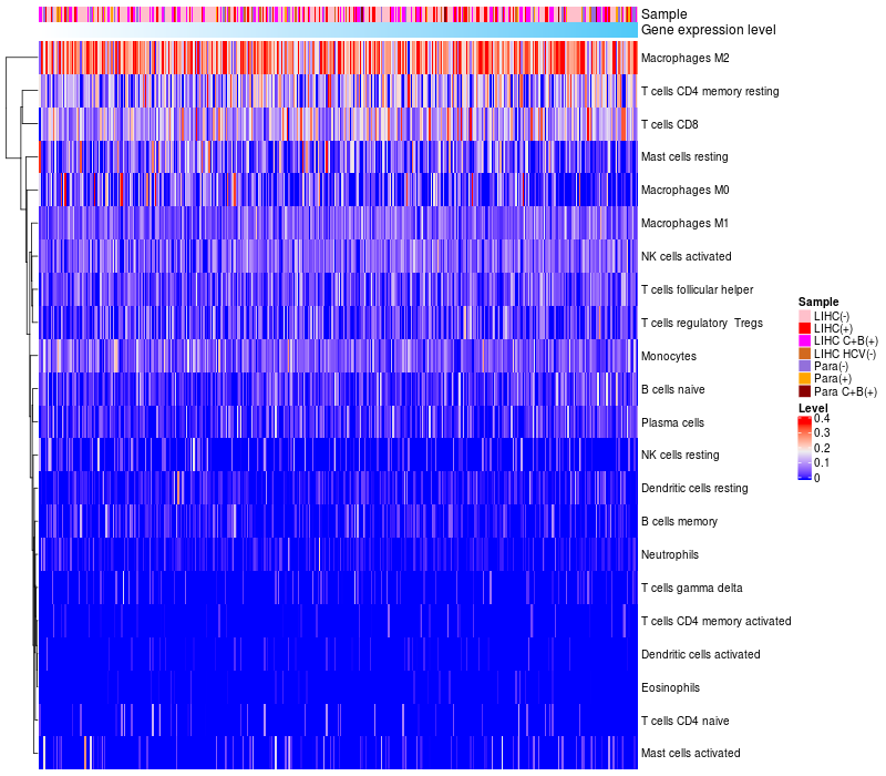 Liver hepatocellular carcinoma HCV (HBV+)(86), Liver hepatocellular carcinoma HCV (HBV-)(19), Liver hepatocellular carcinoma (HBV+)(209), Liver hepatocellular carcinoma (HBV+)(60), Paracancerous HCV (HBV+)(4), Paracancerous (HBV-)(28), Paracancerous (HBV+)(18) |