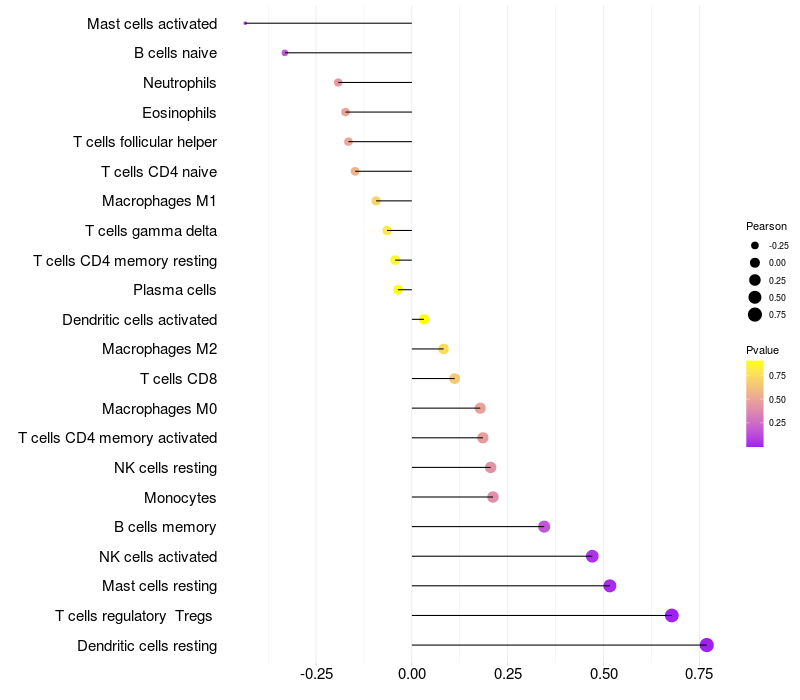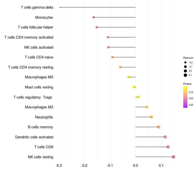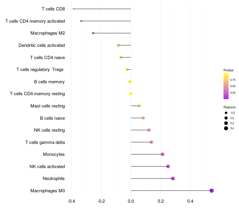 Lollipop of UNC5B expression and immune infiltrating cell level correlation result in HTLV1+ samples