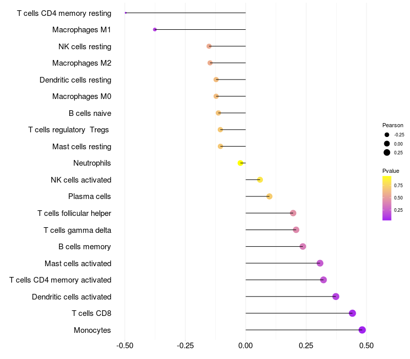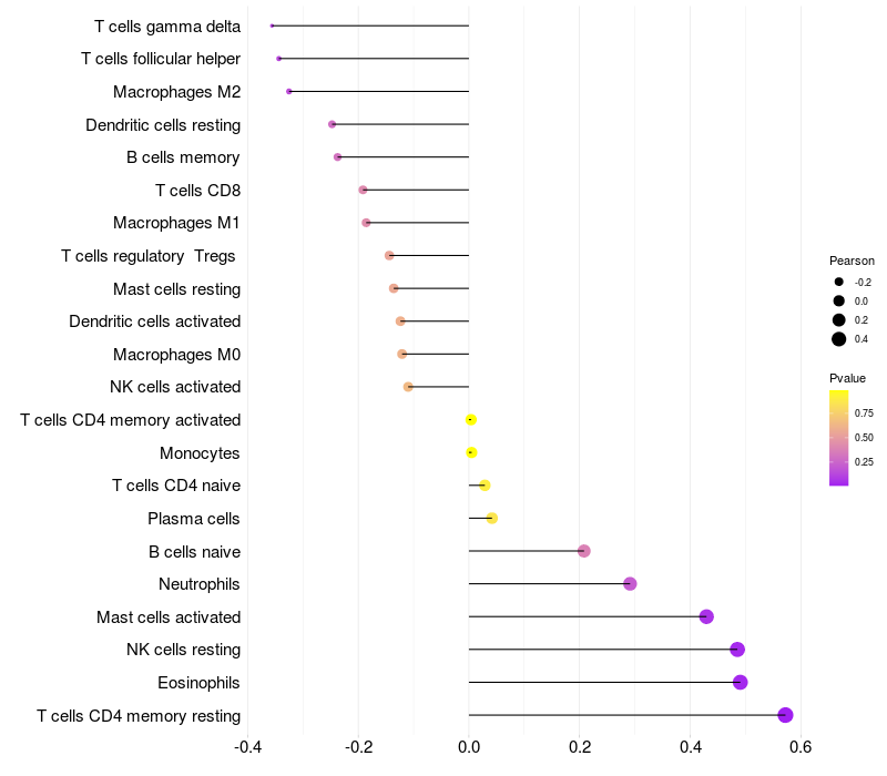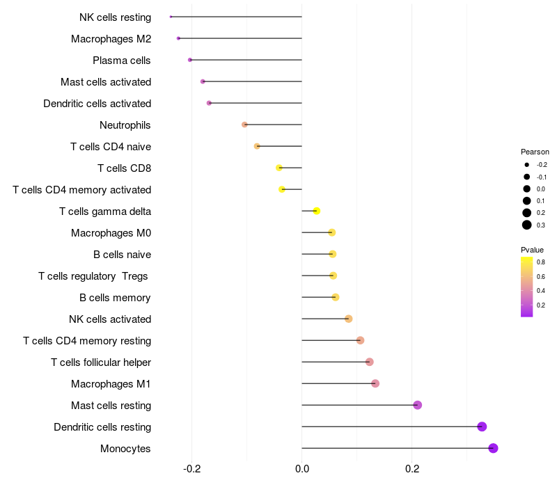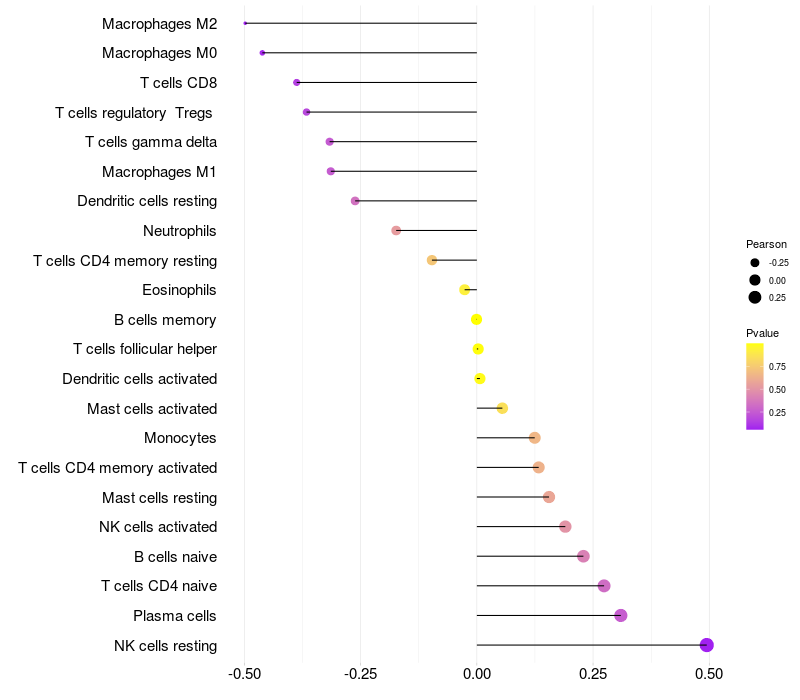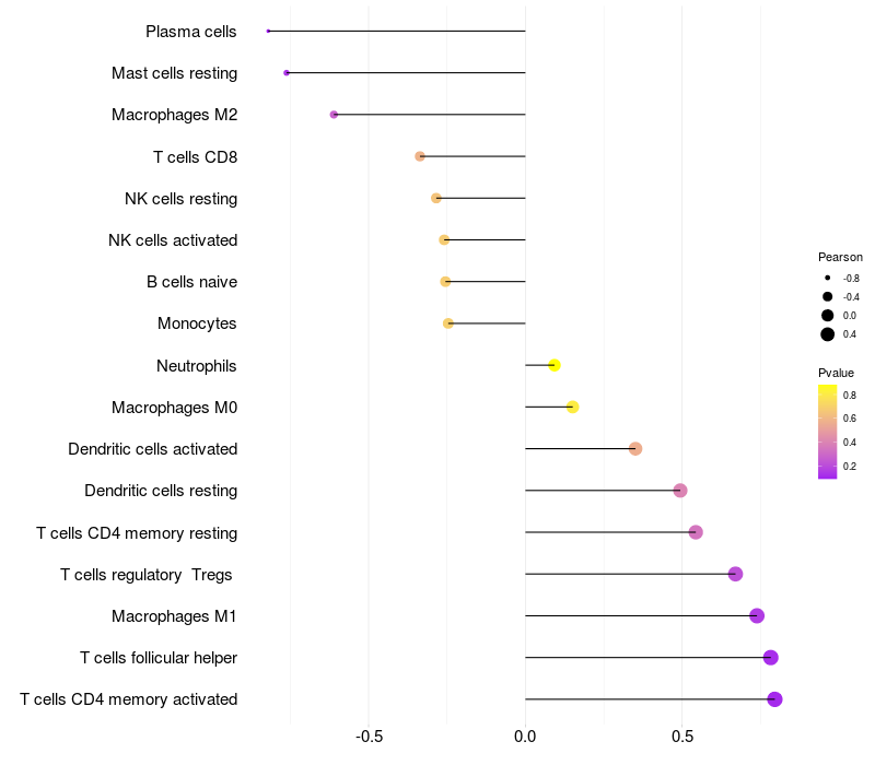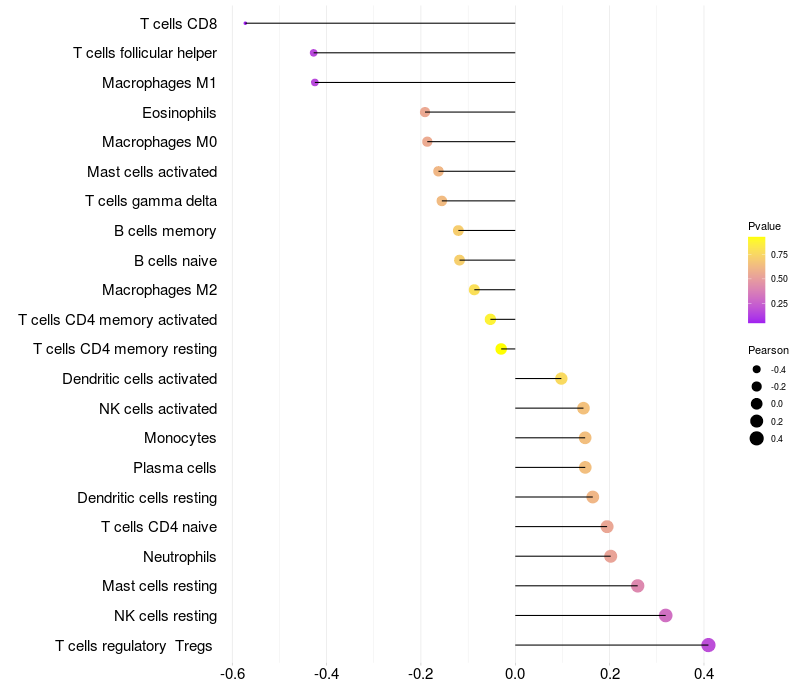 Lollipop of UOX expression and immune infiltrating cell level correlation result in HPV+ samples