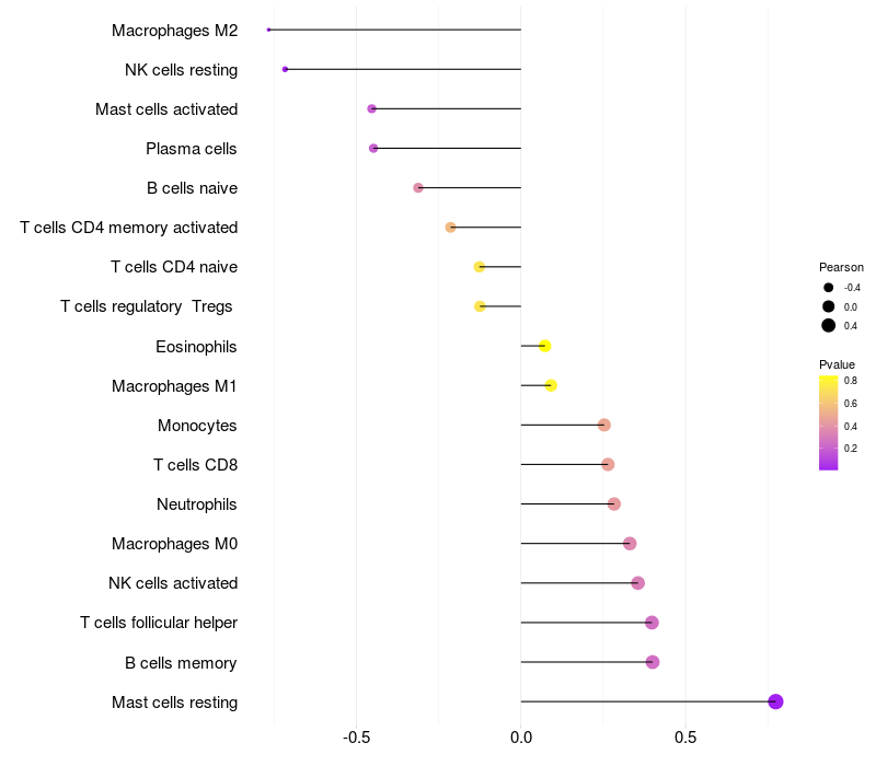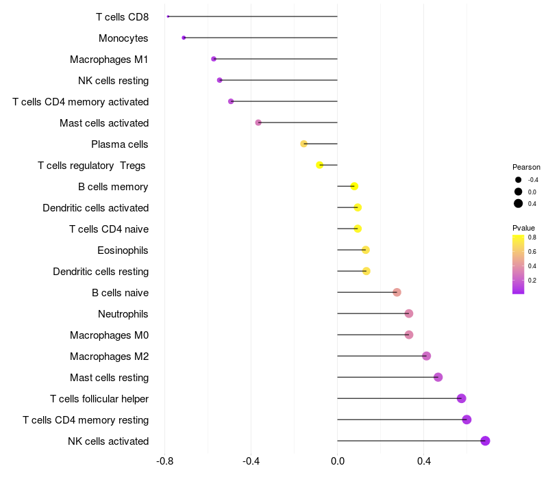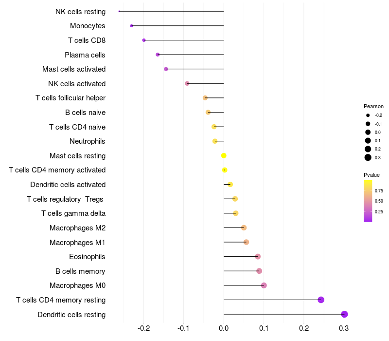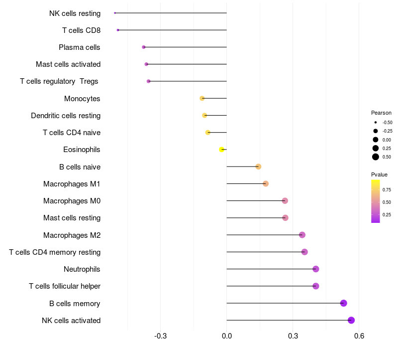 Lollipop of UPF2 expression and immune infiltrating cell level correlation result in HBV+ Liver cirrhosis samples