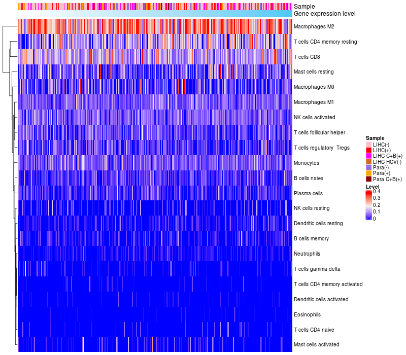 Liver hepatocellular carcinoma HCV (HBV+)(86), Liver hepatocellular carcinoma HCV (HBV-)(19), Liver hepatocellular carcinoma (HBV+)(209), Liver hepatocellular carcinoma (HBV+)(60), Paracancerous HCV (HBV+)(4), Paracancerous (HBV-)(28), Paracancerous (HBV+)(18) |