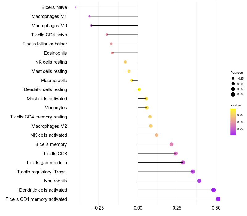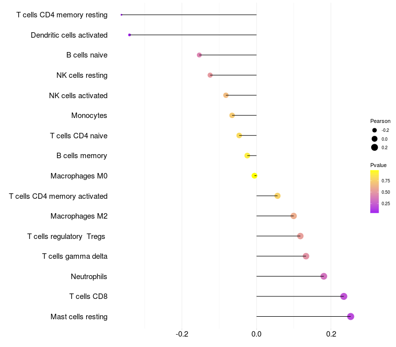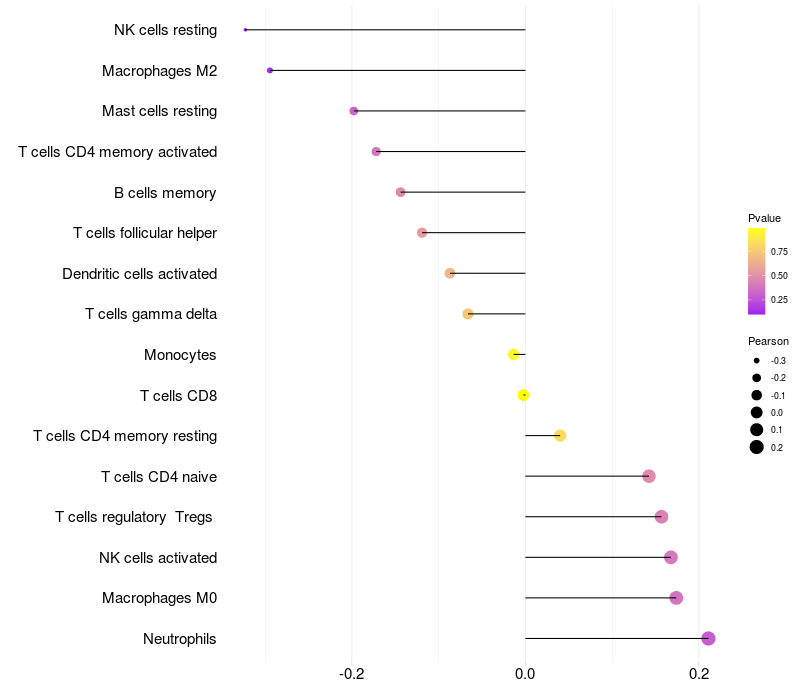 Lollipop of UPP2 expression and immune infiltrating cell level correlation result in HTLV1+ samples