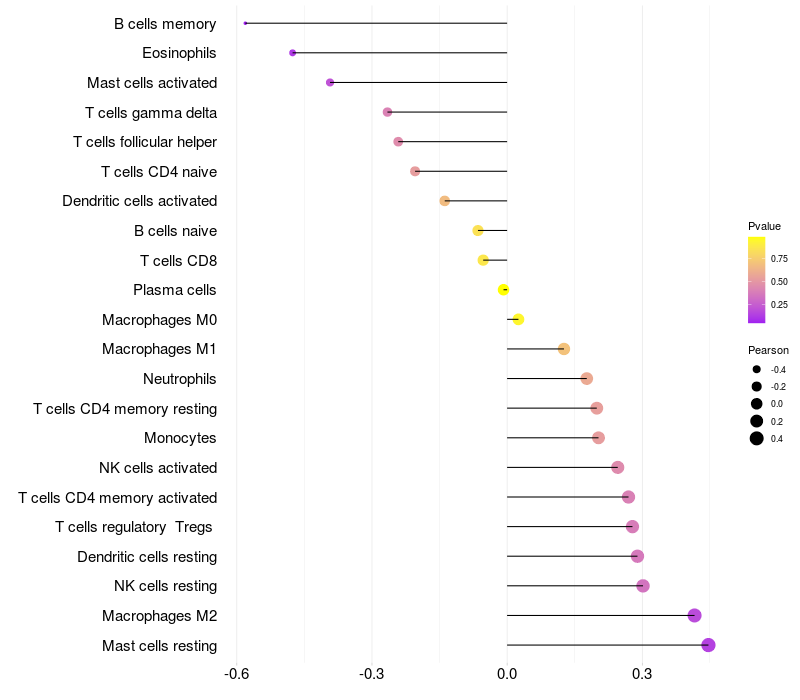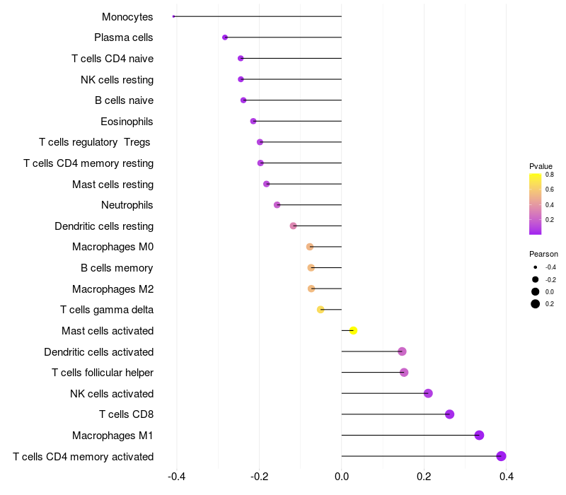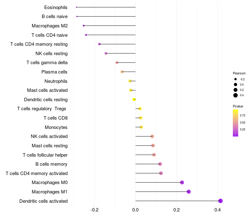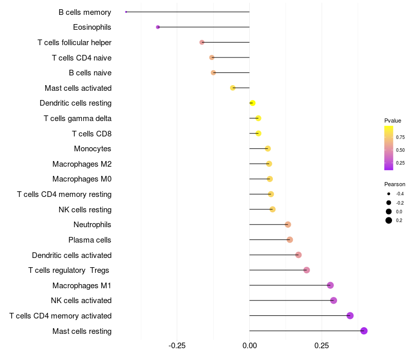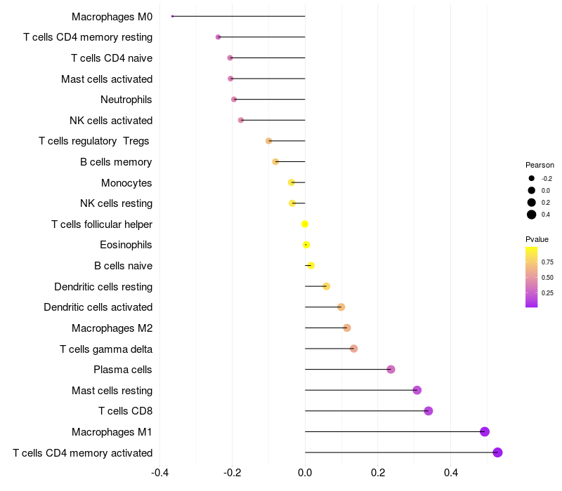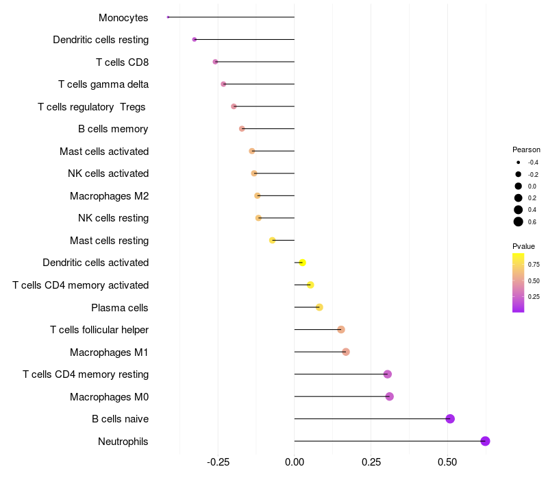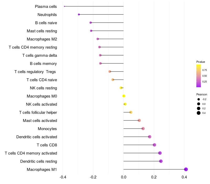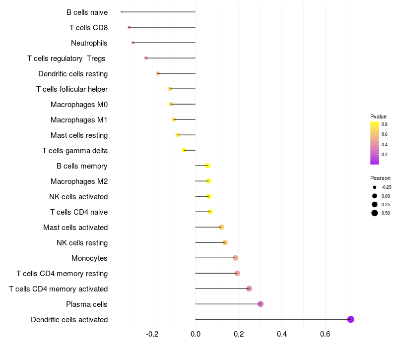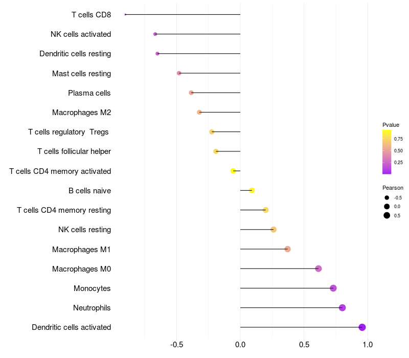Lollipop of USP18 expression and immune infiltrating cell level correlation result in HPV+ samples