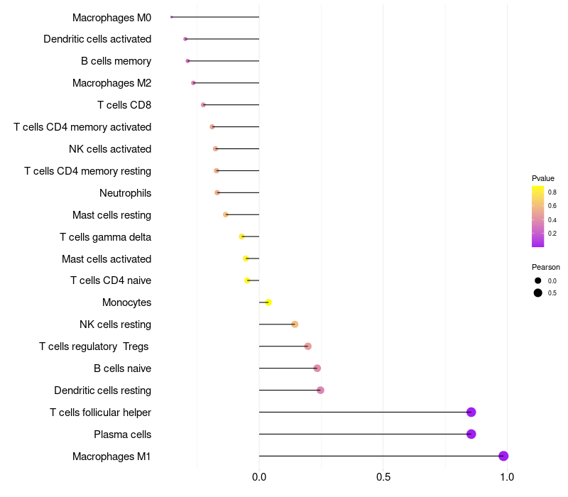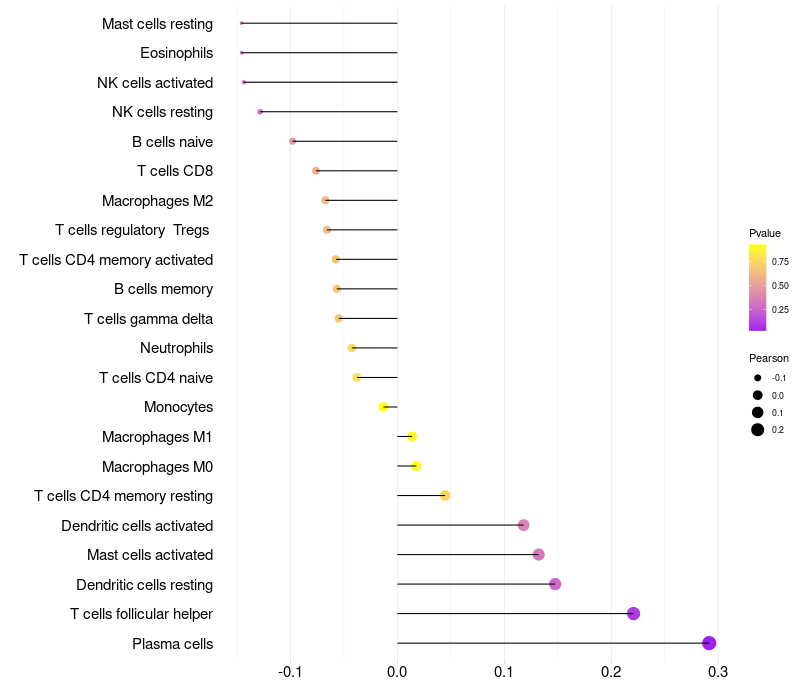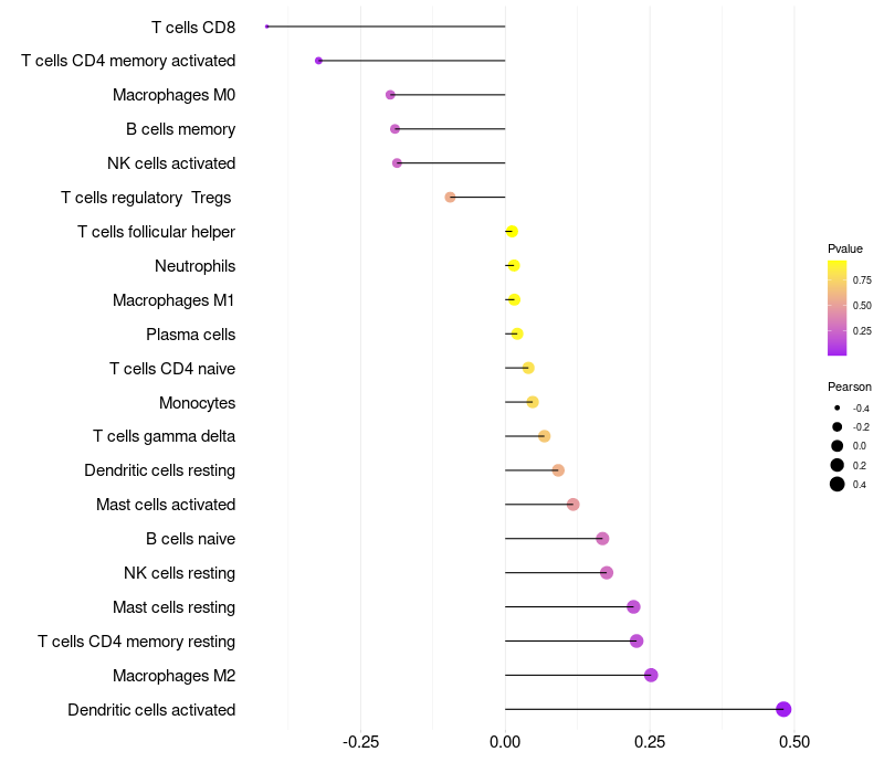 Lollipop of USP46 expression and immune infiltrating cell level correlation result in HPV+ samples