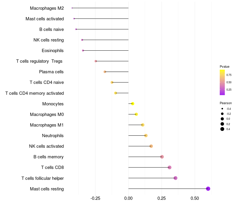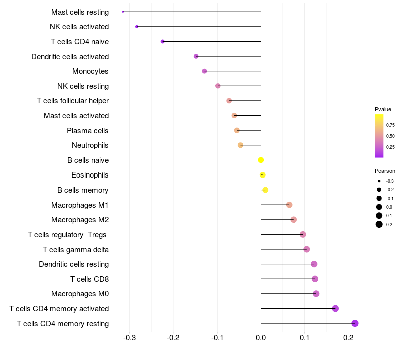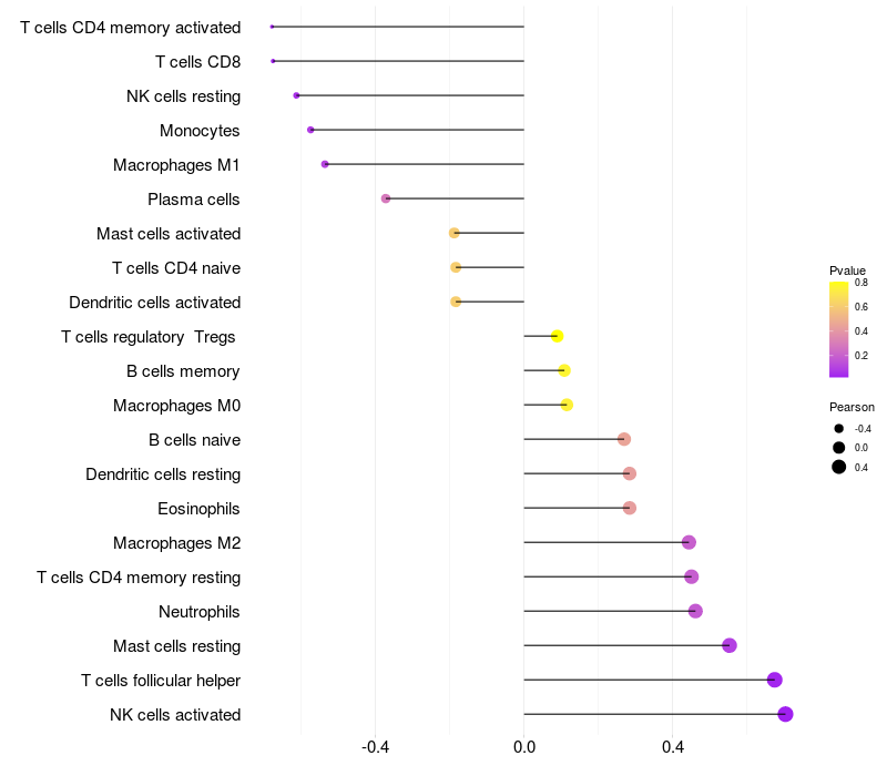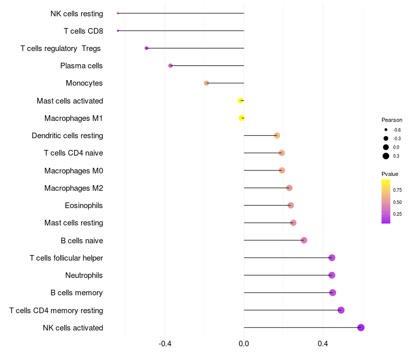 Lollipop of USP48 expression and immune infiltrating cell level correlation result in HBV+ Liver cirrhosis samples