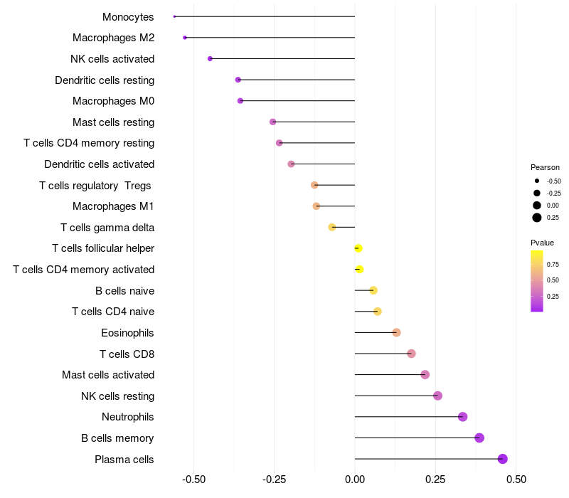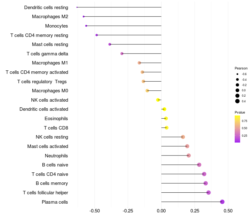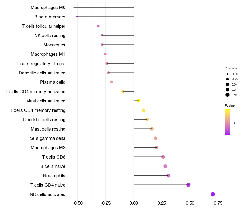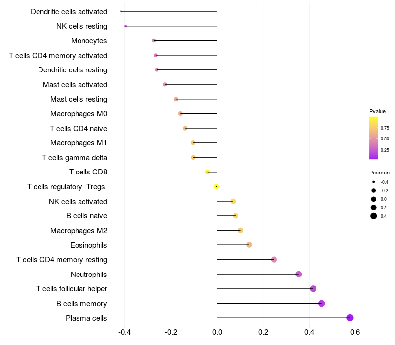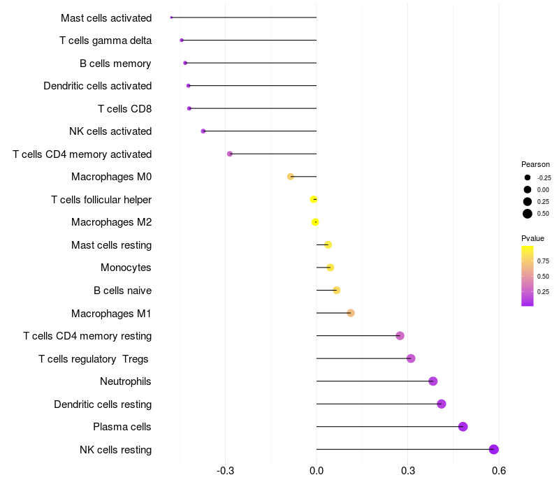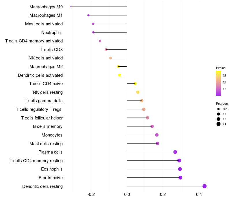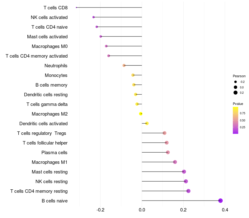 Lollipop of USP6NL expression and immune infiltrating cell level correlation result in HPV+ samples
