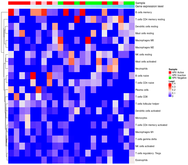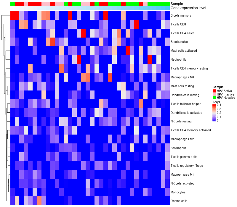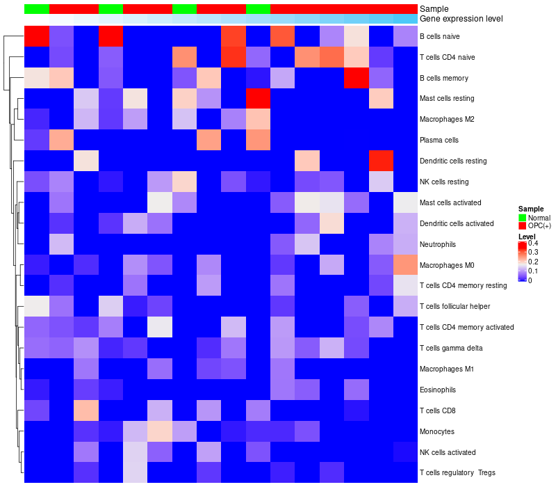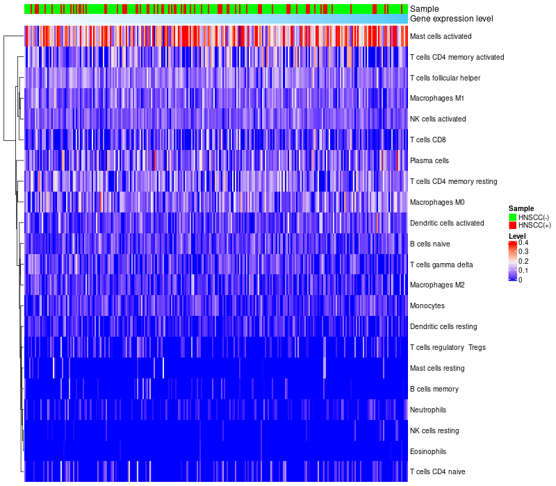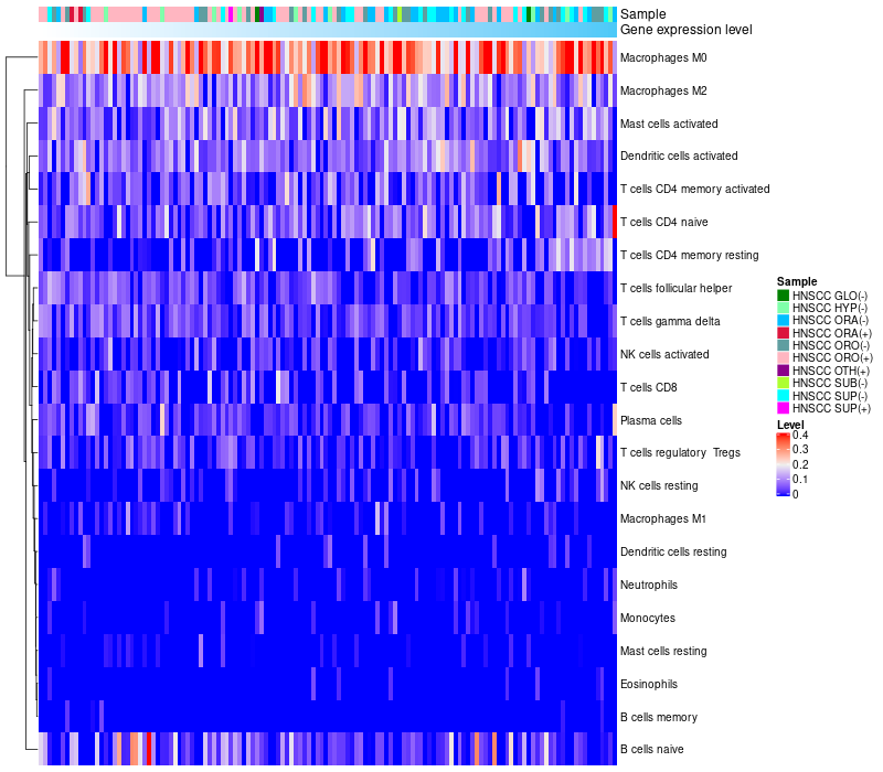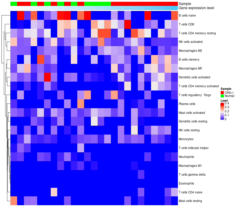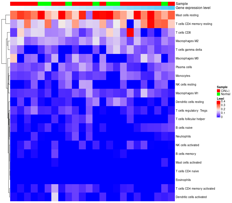 • Left: Heatmap of target gene expression and the level of various types of immune cells (cell type fractions) in all samples based on CIBERSORT method.