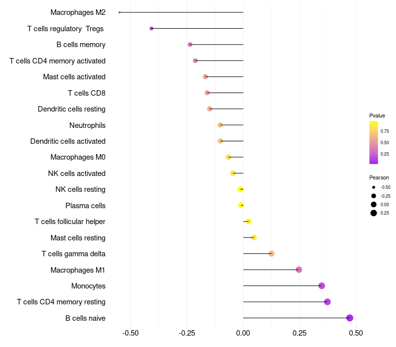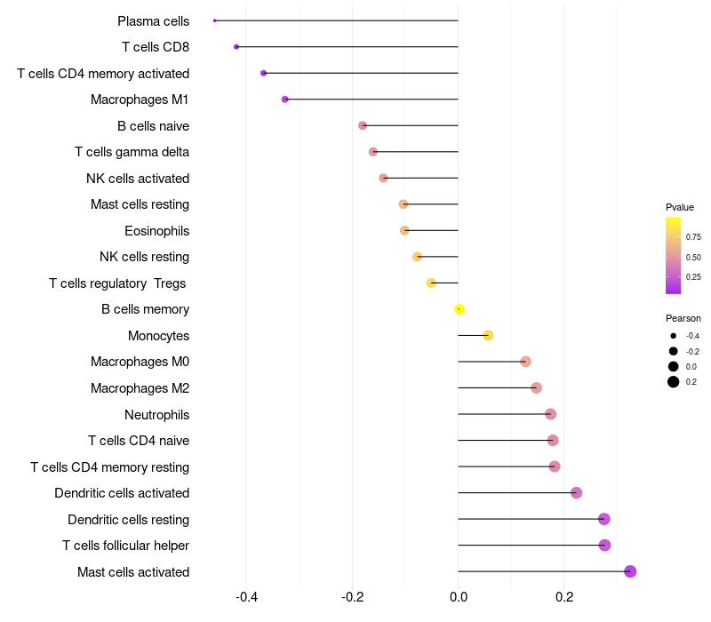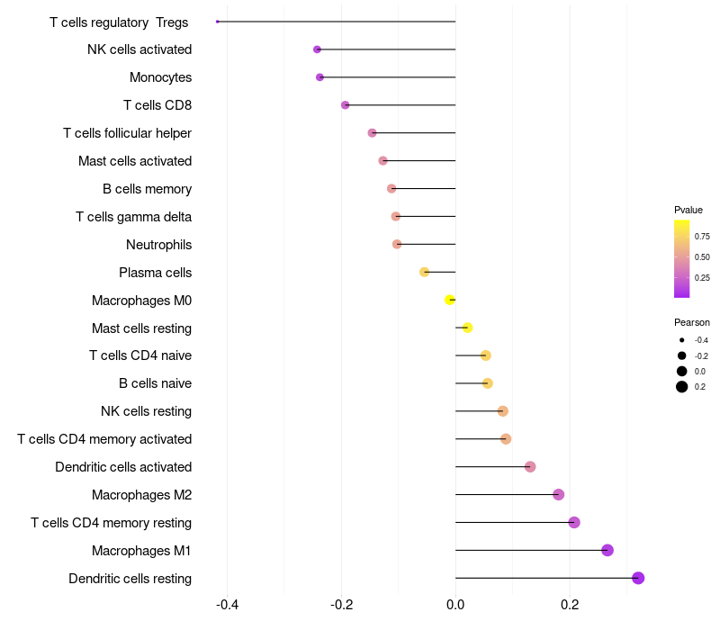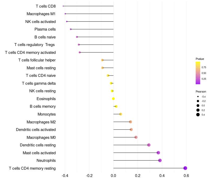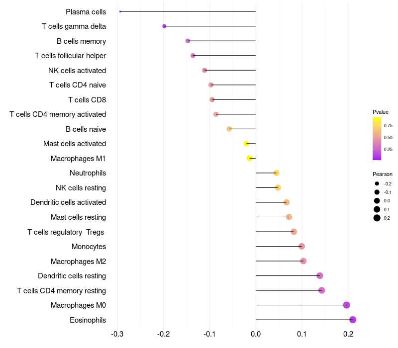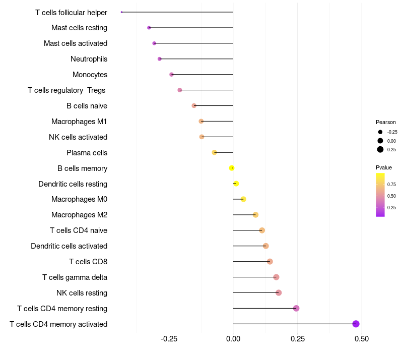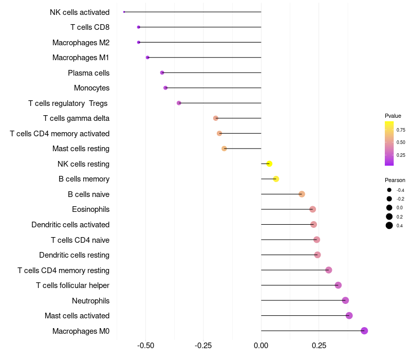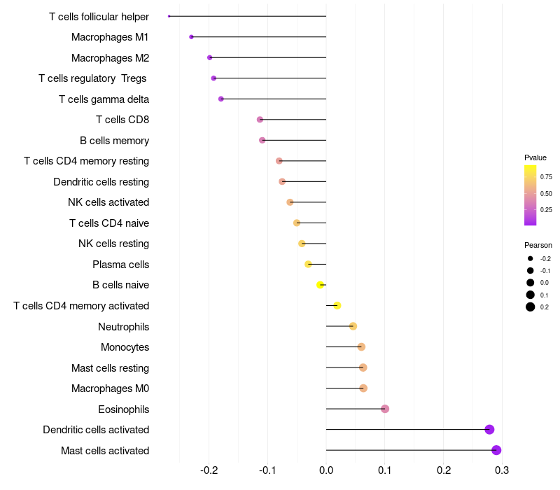 • Right: Correlation of target gene expression and the level of various types of immune cells in virus positive samples (Pearson Correlation Coefficient).