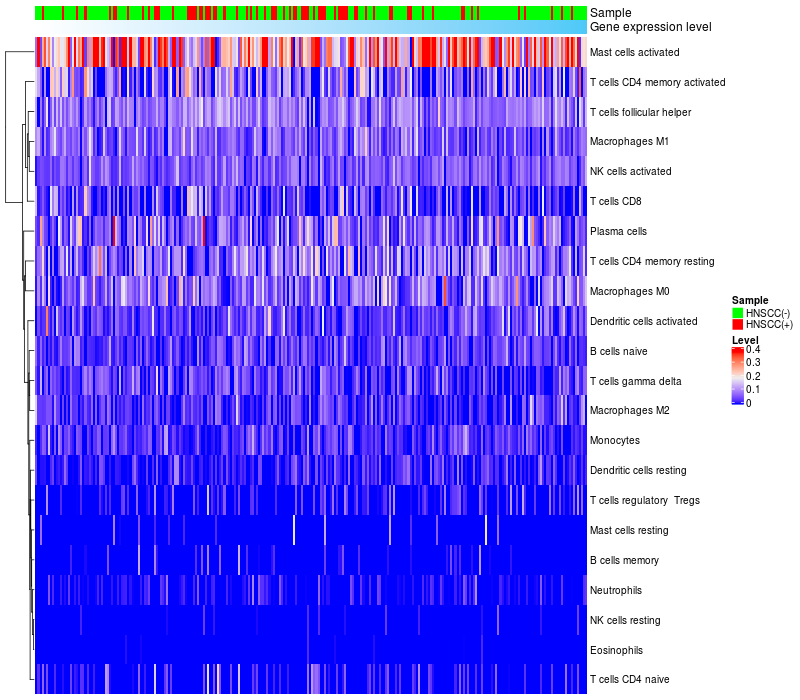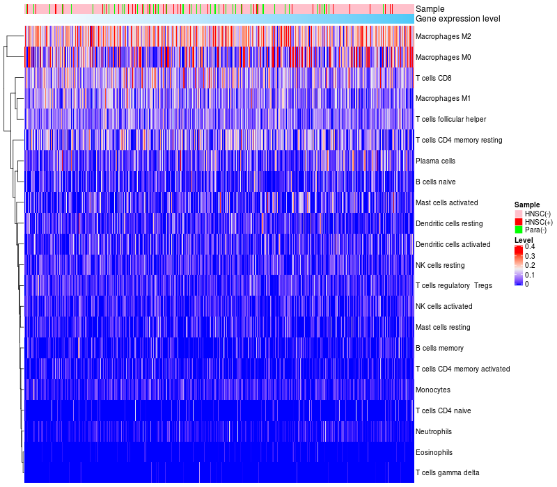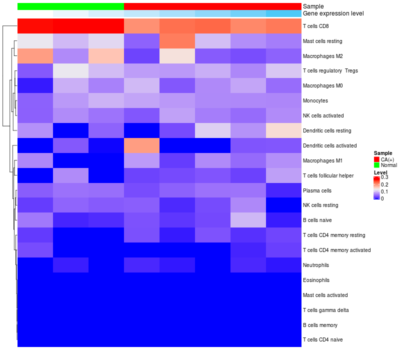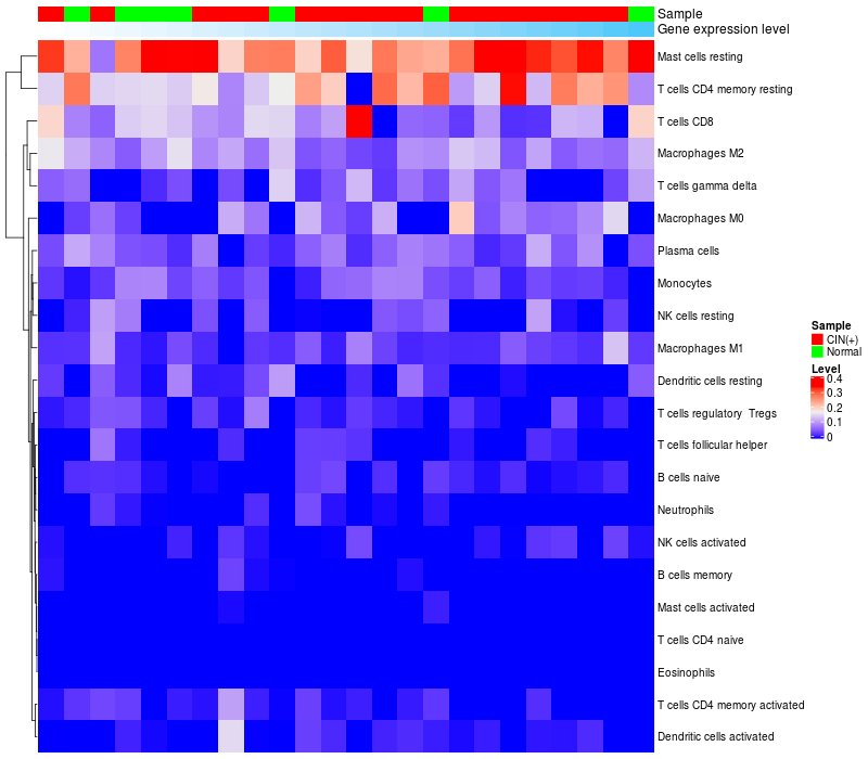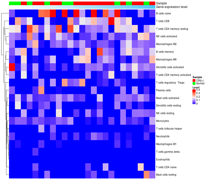 • Left: Heatmap of target gene expression and the level of various types of immune cells (cell type fractions) in all samples based on CIBERSORT method.
