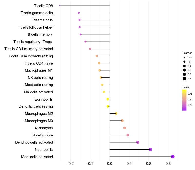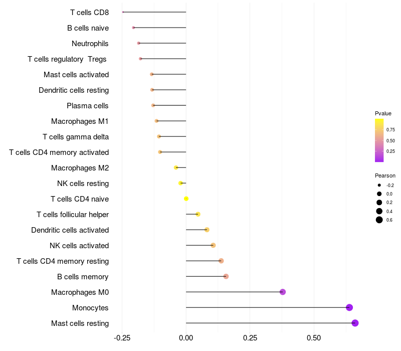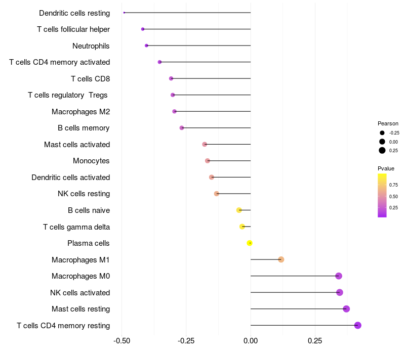 • Right: Correlation of target gene expression and the level of various types of immune cells in virus positive samples (Pearson Correlation Coefficient).