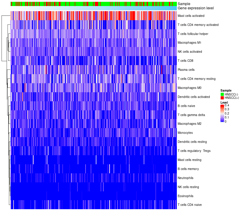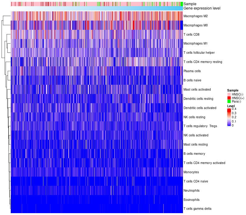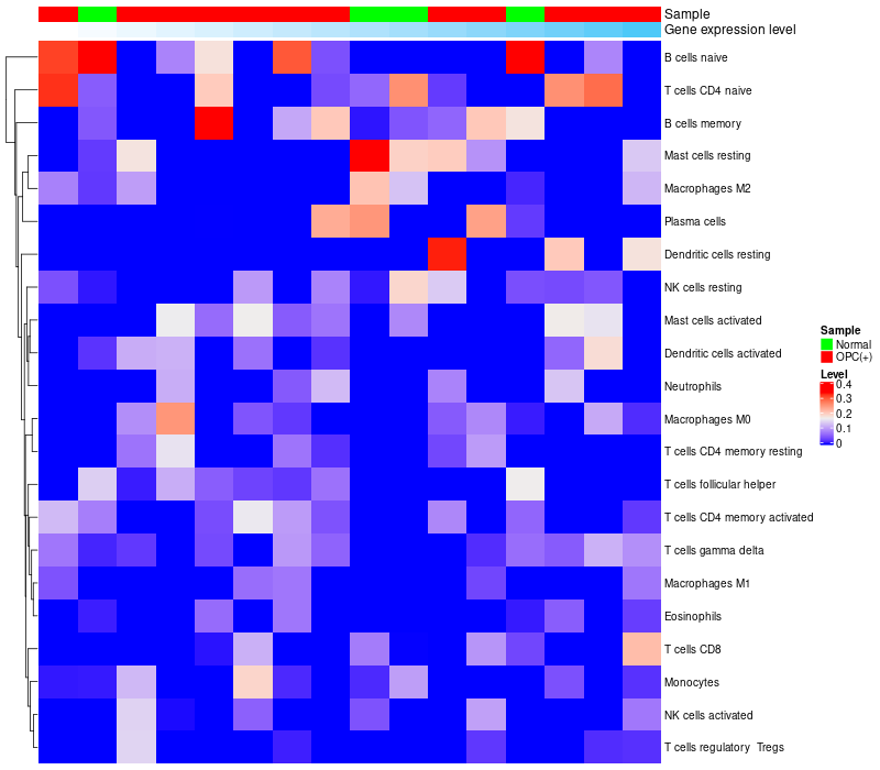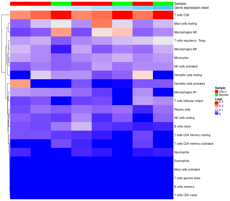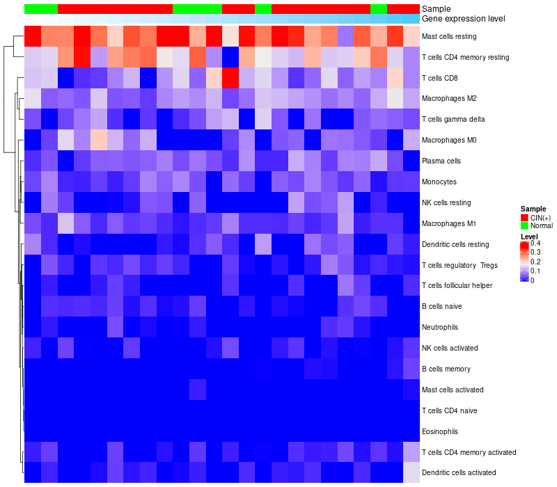 • Left: Heatmap of target gene expression and the level of various types of immune cells (cell type fractions) in all samples based on CIBERSORT method.