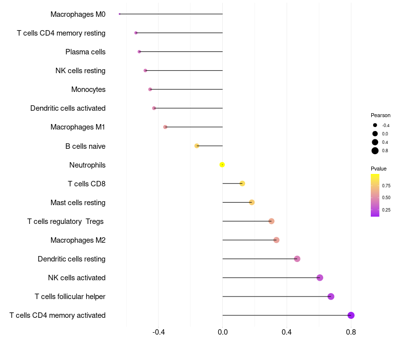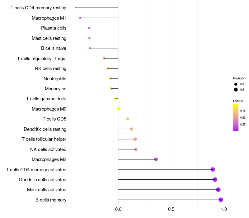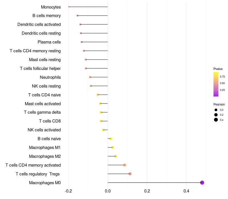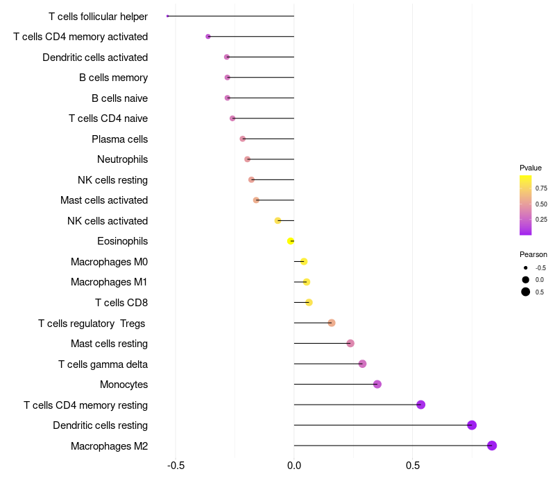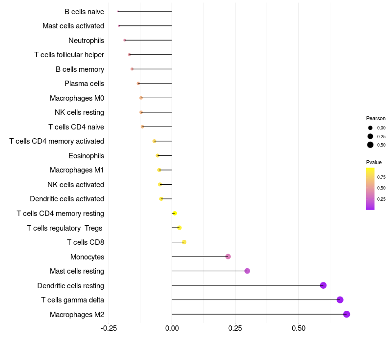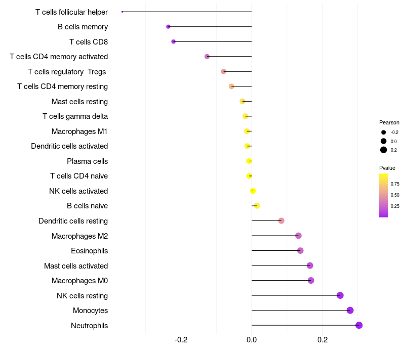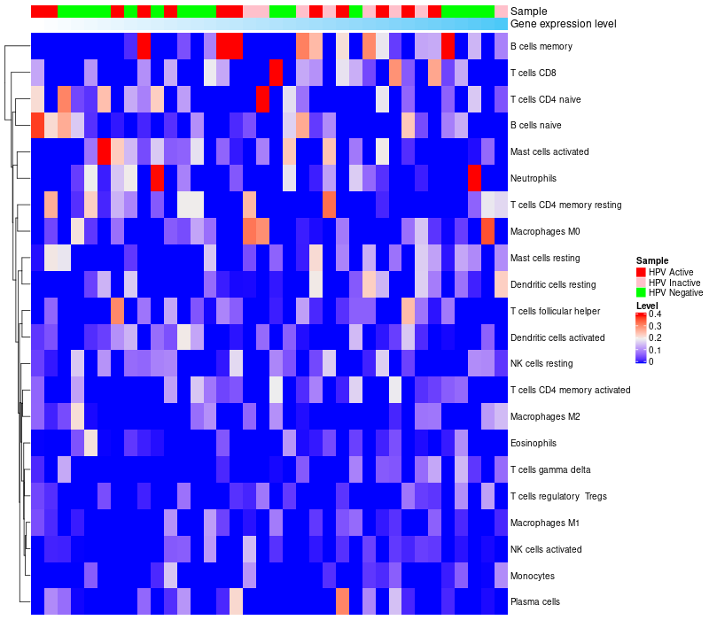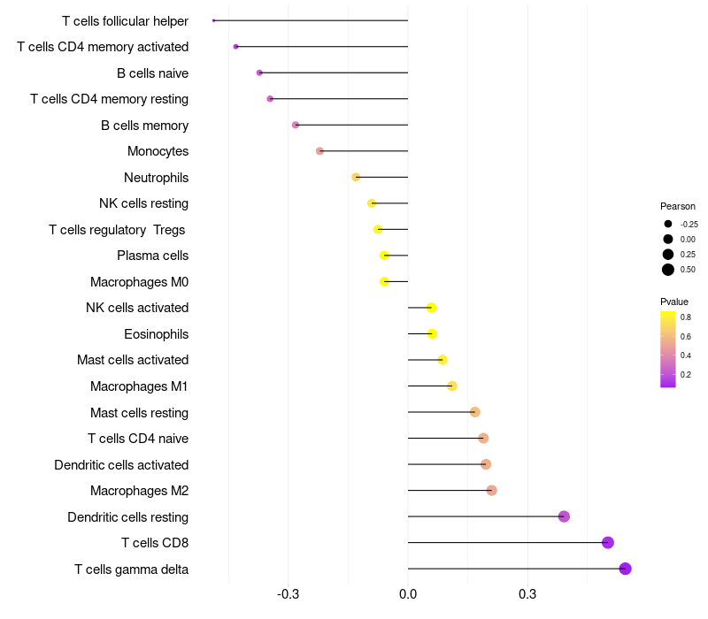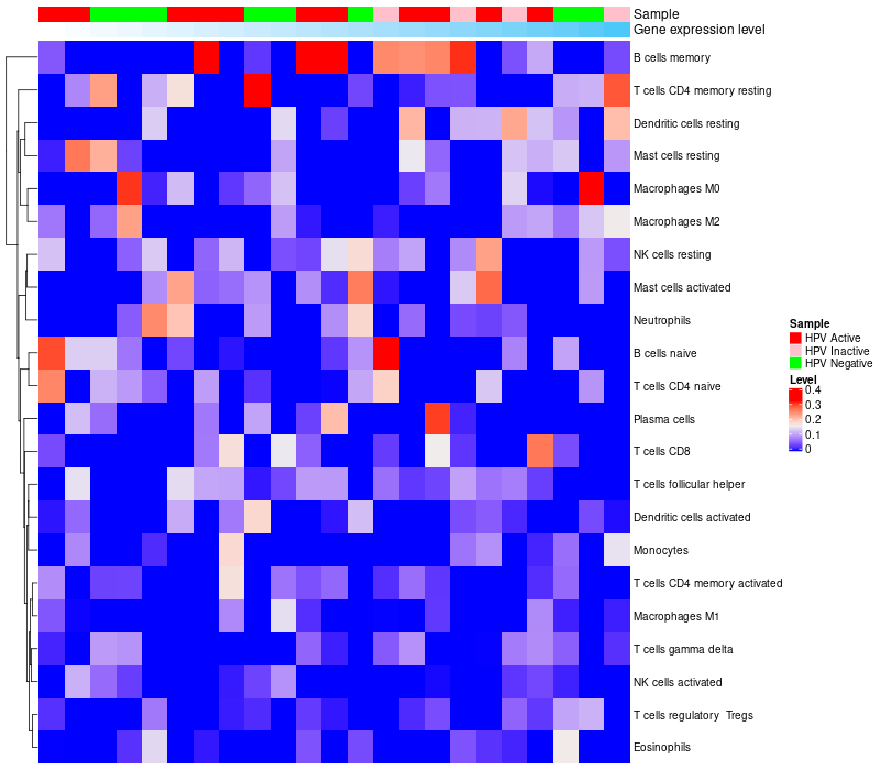 HeatMap of cell type fractions in all samples Lollipop of VGLL2 expression and immune infiltrating cell level correlation result in HPV+ samples