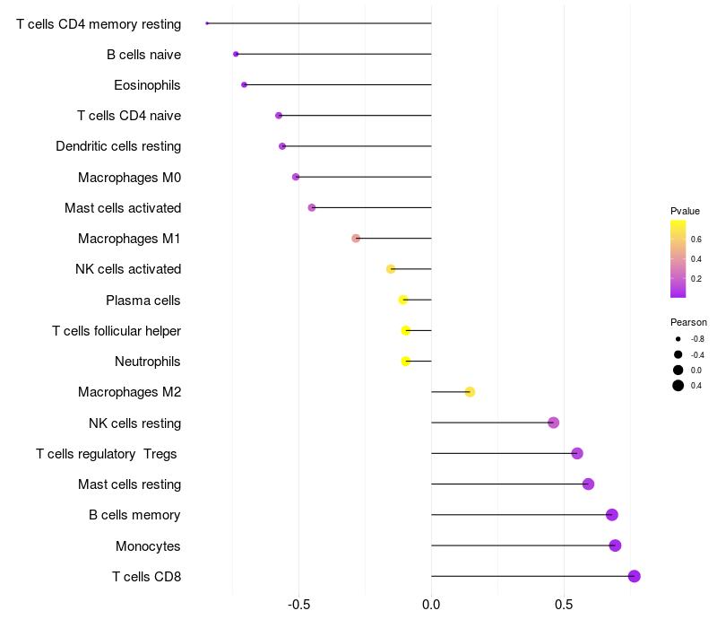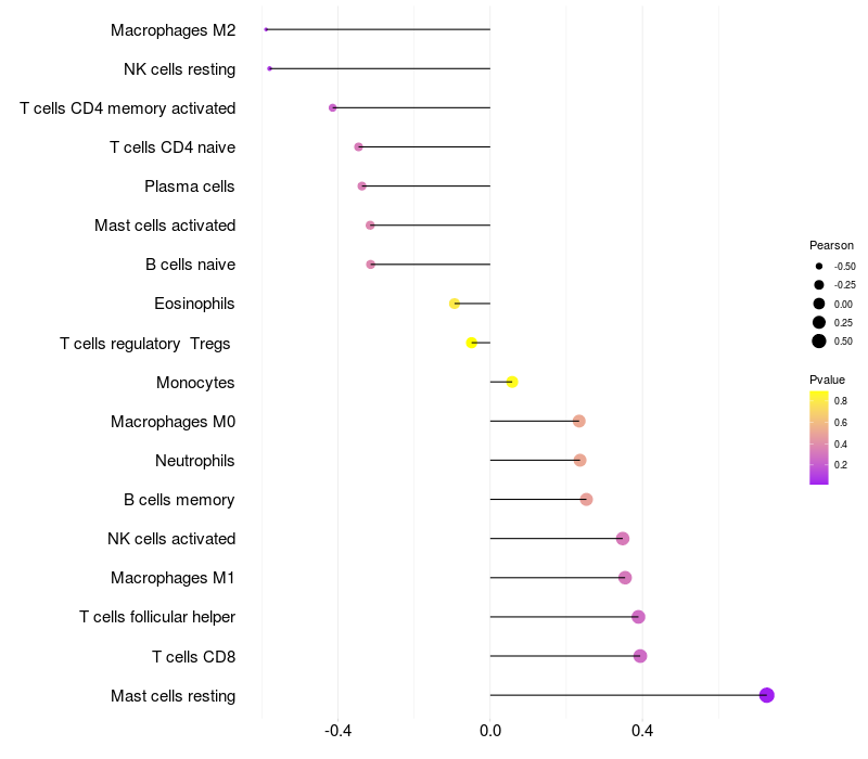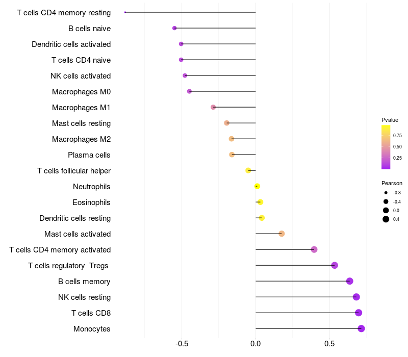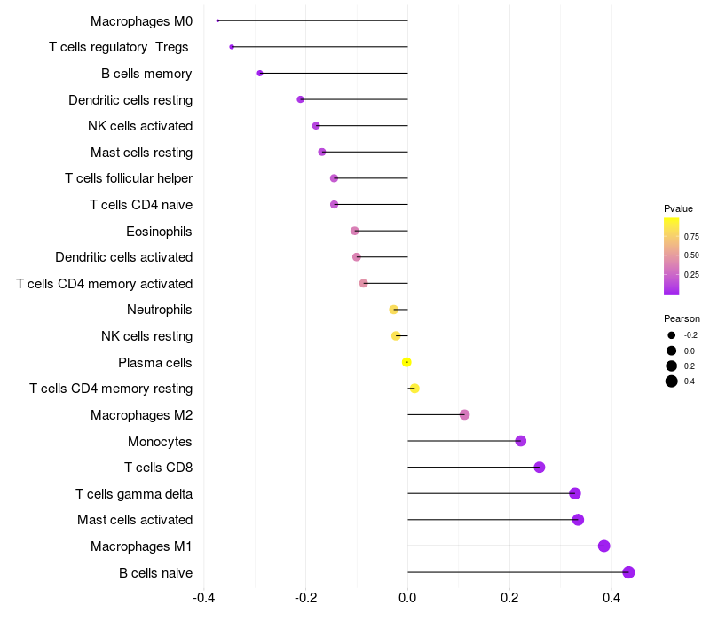 Lollipop of VIPR1 expression and immune infiltrating cell level correlation result in HBV+ Liver cirrhosis samples