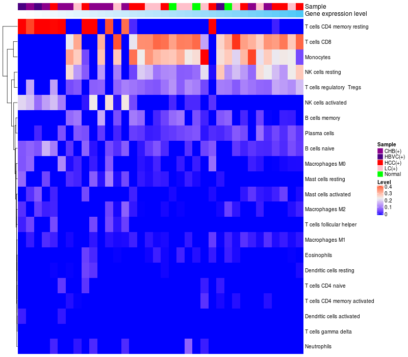 Chronic hepatitis B patients (HBV+)(10),Hepatocellular carcinoma (HBV+)(10),Liver cirrhosis(HBV+)(10),Normal(3),HBV carriers (3) |